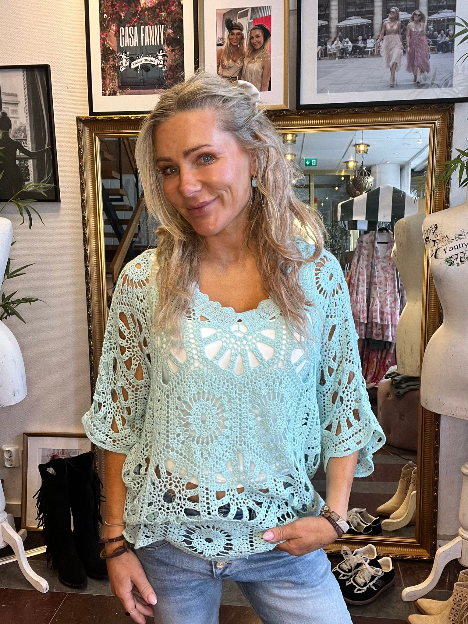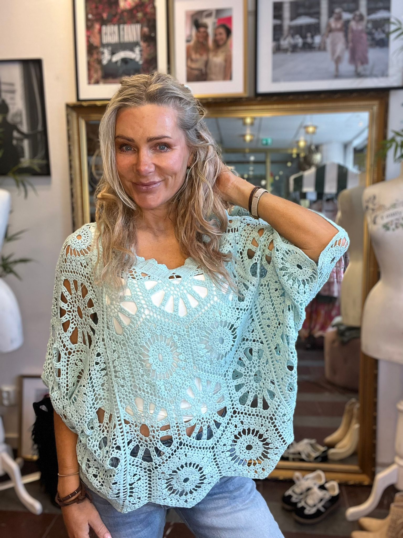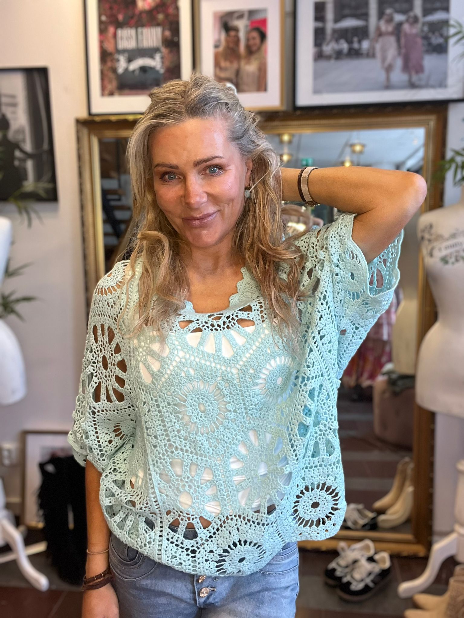Alva – Virkad topp med pingvinärm – Aqua