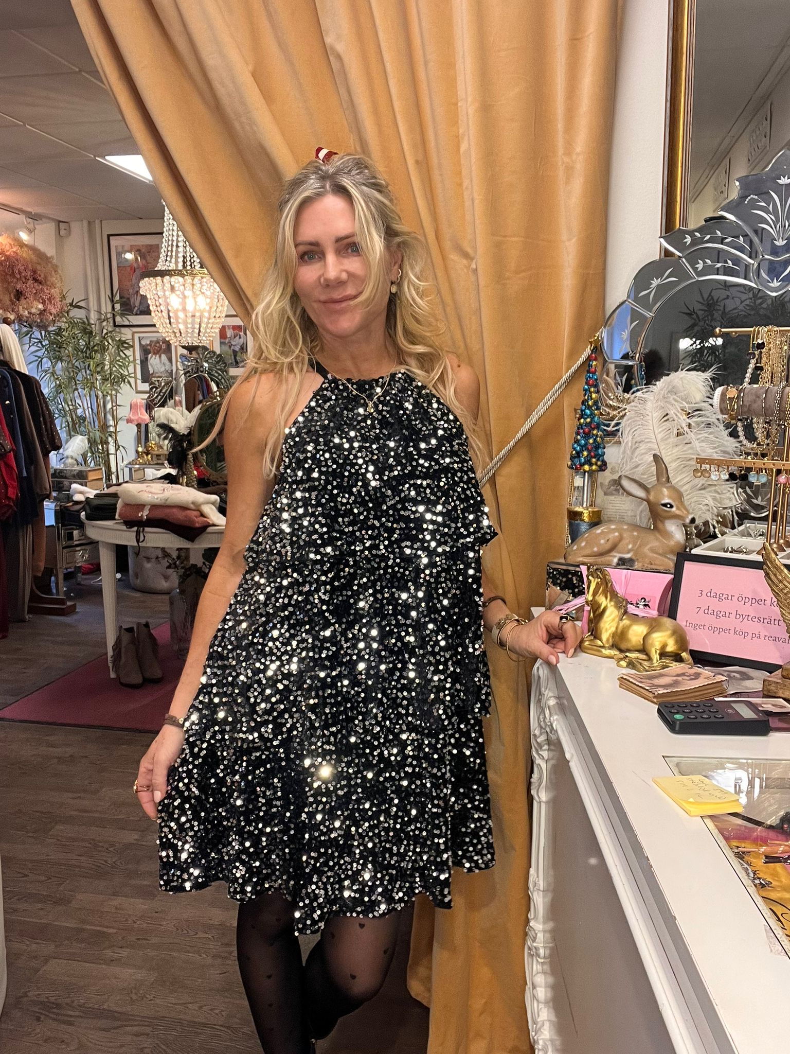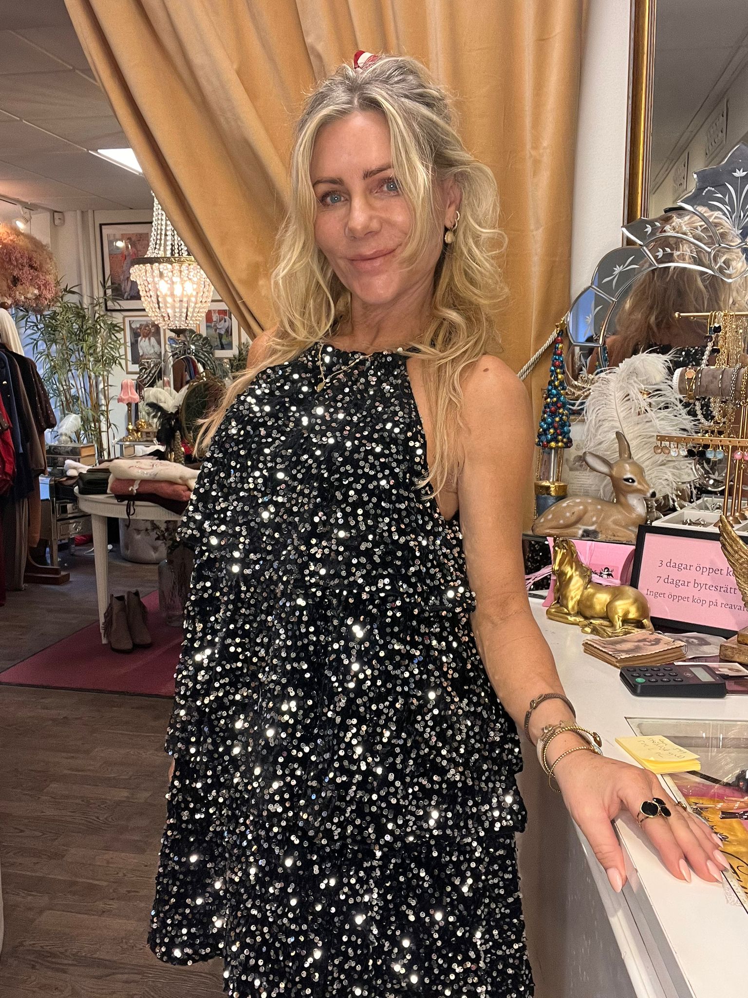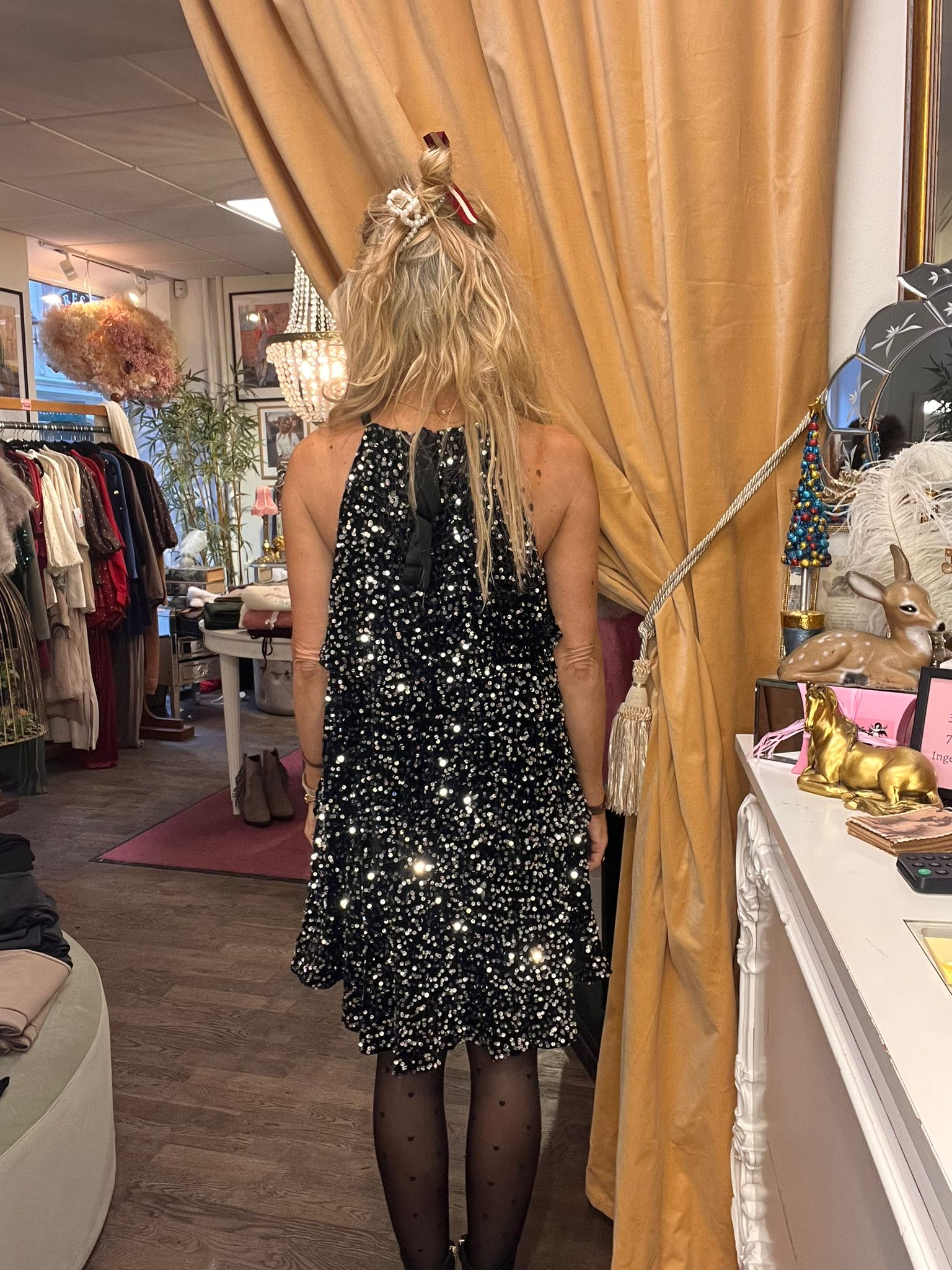 Underbar volangklänning med paljetter och en rosett i nacken!