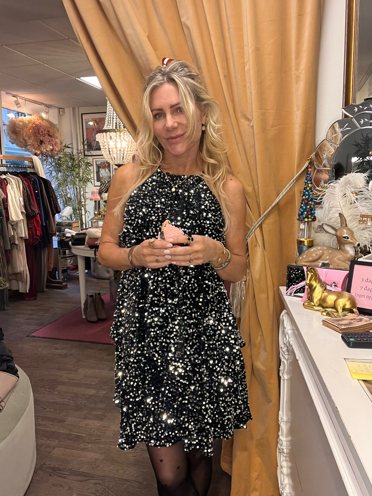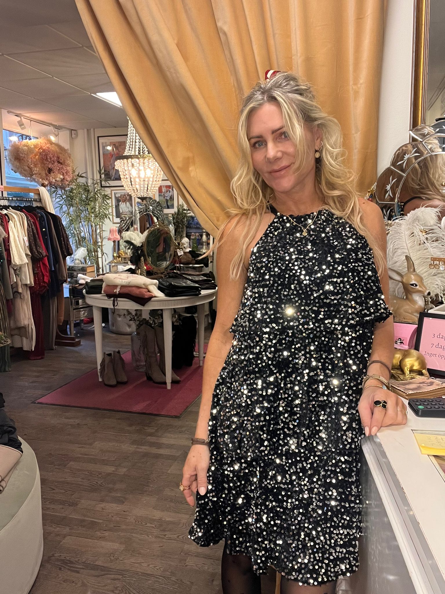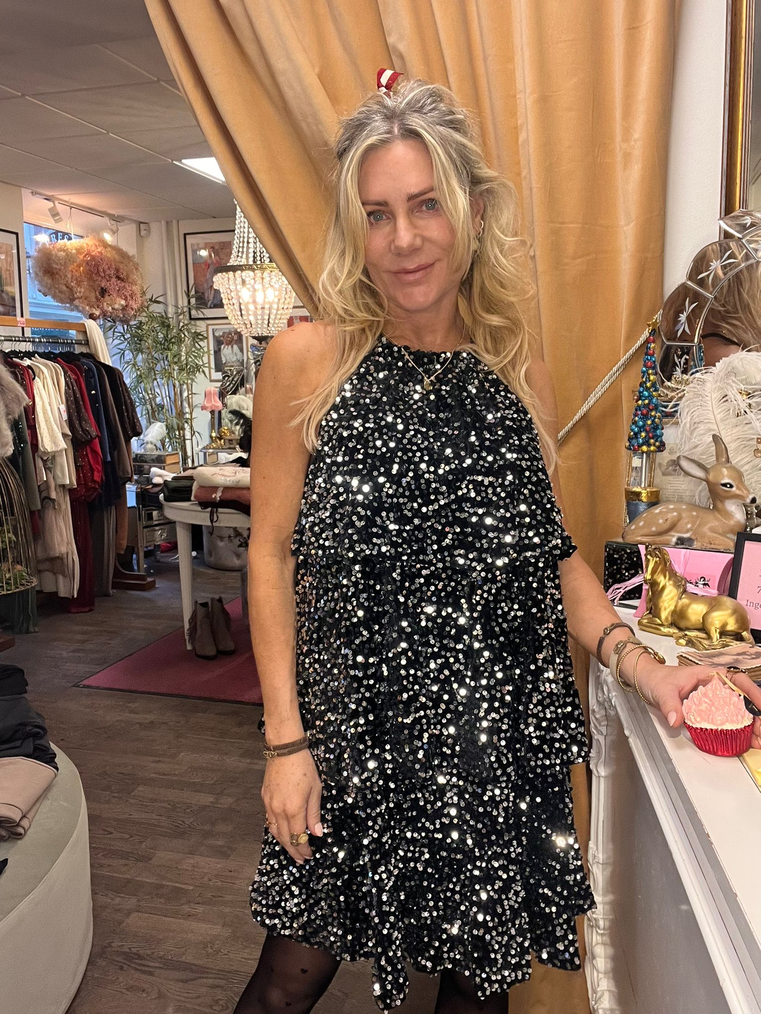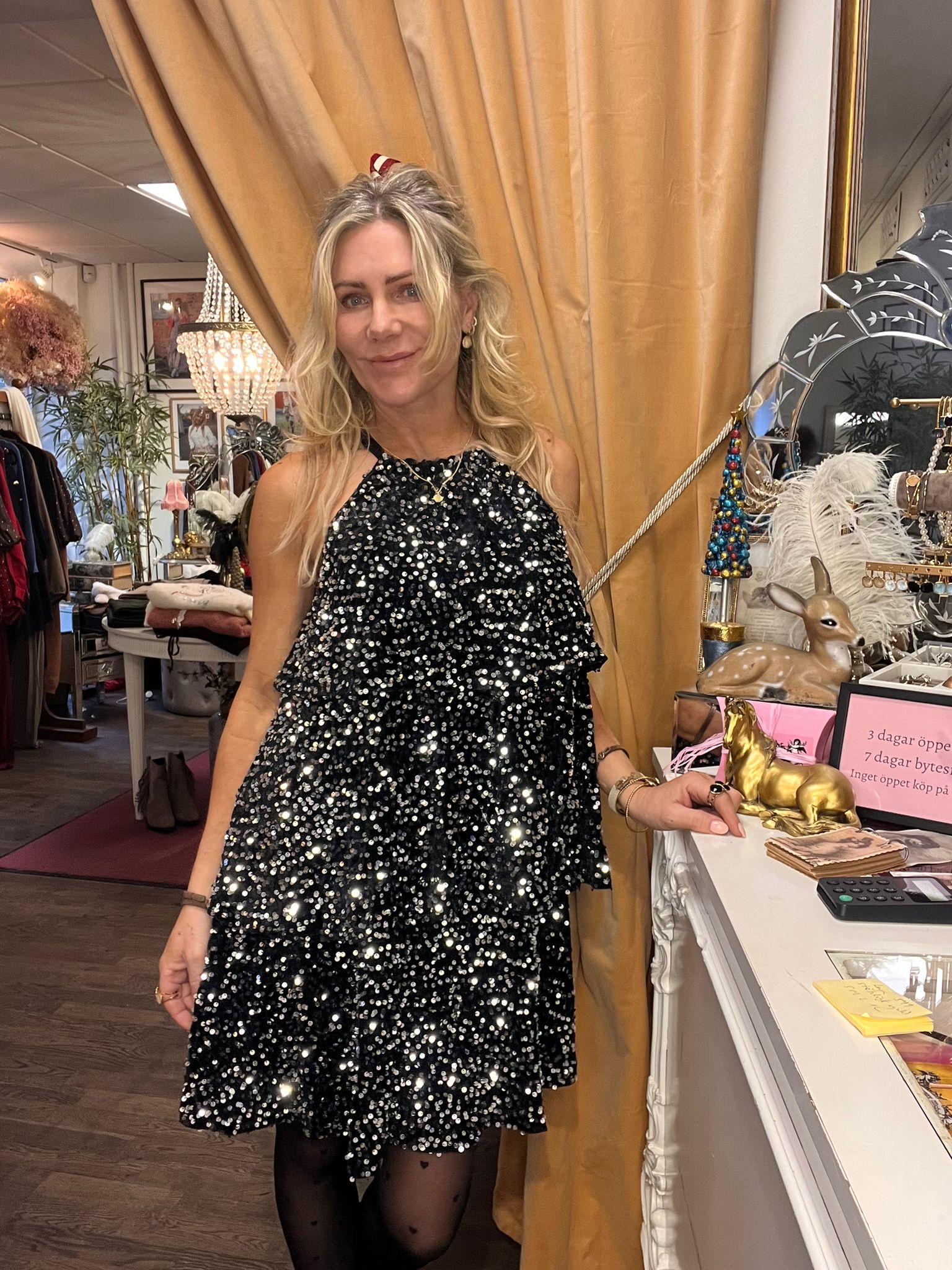 Underbar volangklänning med paljetter och en rosett i nacken!