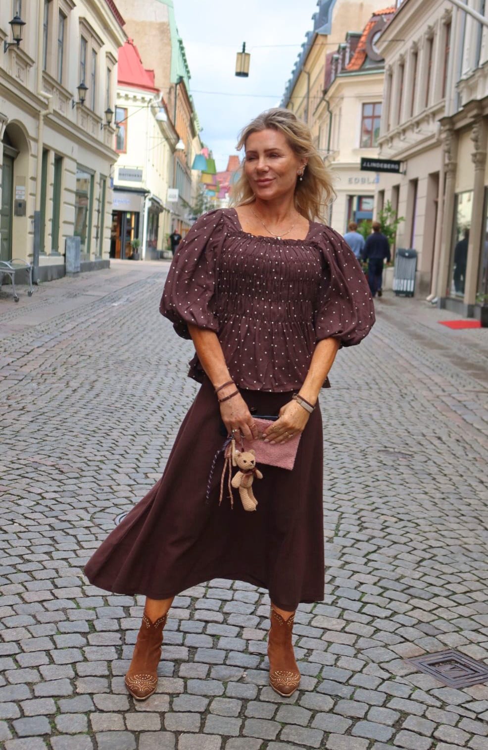 Stretchigt smock över bysten. Mått: S/36 Armhåla till armhåla omkrets: ca 80 cm kan stretchas ut mer i smocken Längd axel och ner: ca 59 cm M/38 Armhåla till armhåla omkrets: ca 85 cm kan stretchas ut mer i smocken Längd axel och ner: ca 60 cm L/40 Armhåla till armhåla omkrets: ca 90 cm kan stretchas mer i smocken Längd axel och ner: ca 61 cm ———————————————————————— S/36 – L/40, normal i storleken. Modellen på bilden har på sig storlek S/36.Stretchigt smock, normal i storlek