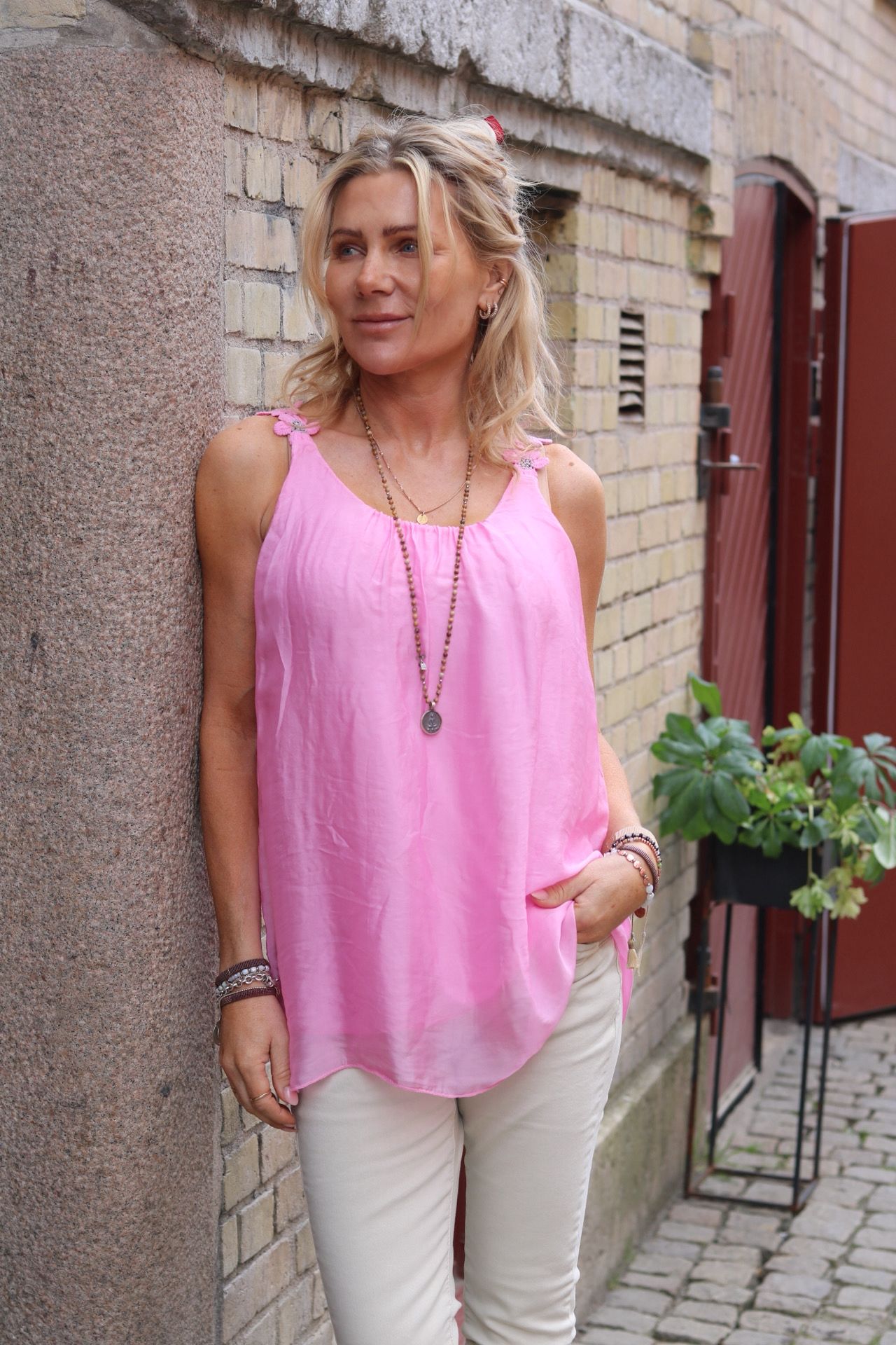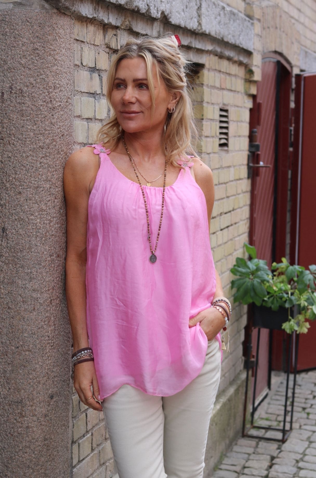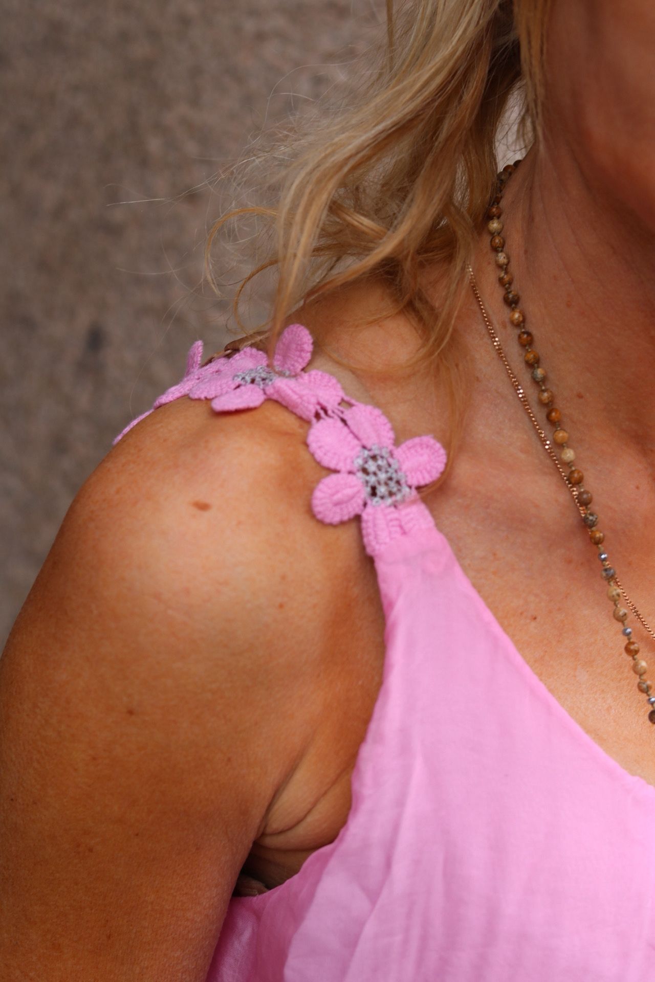 Engla – Silkeslinne med virkade blommor- New Fushia