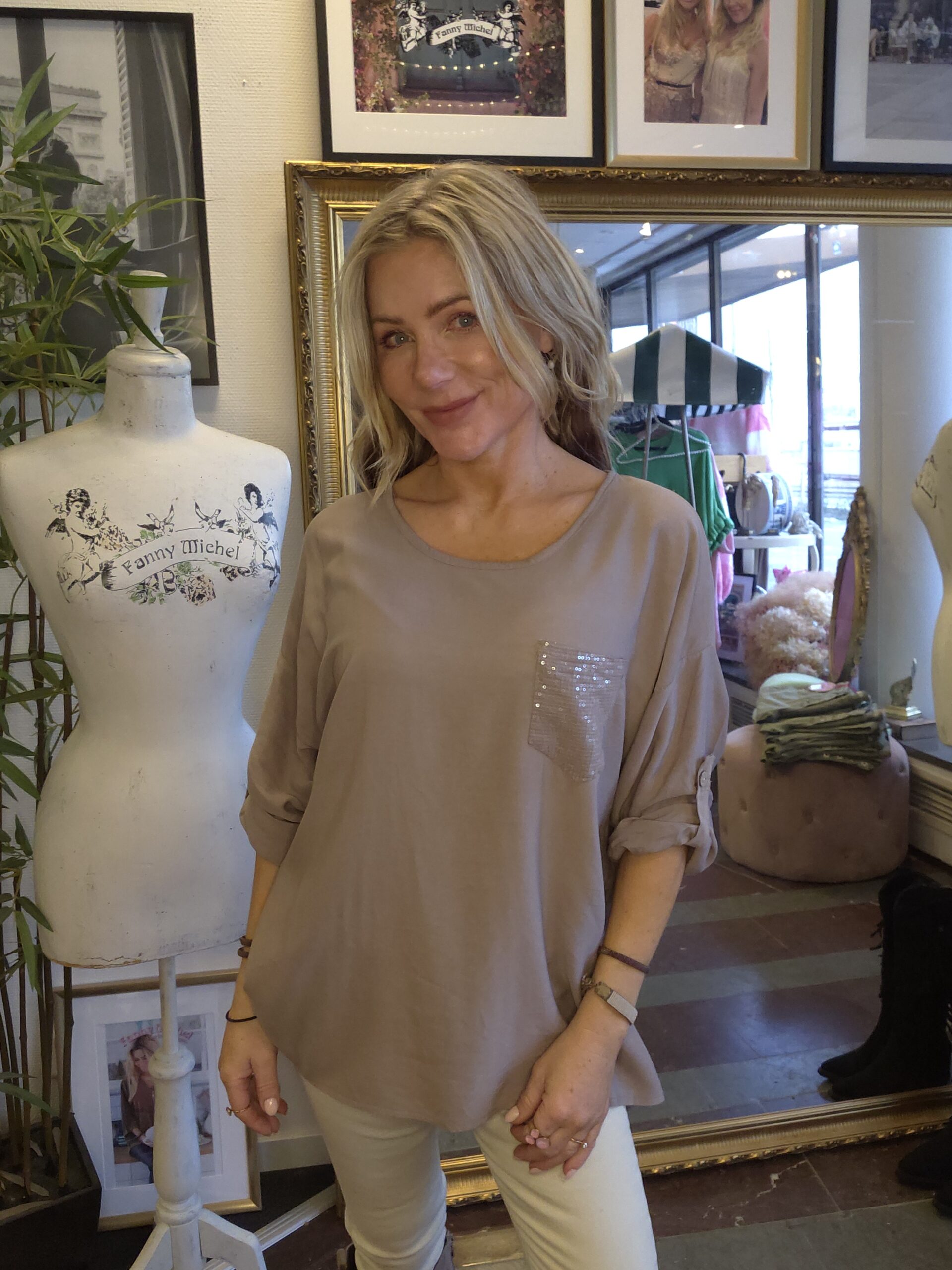 Fanny Michel – Aisha – Viscosetopp med paljettficka – Taupe