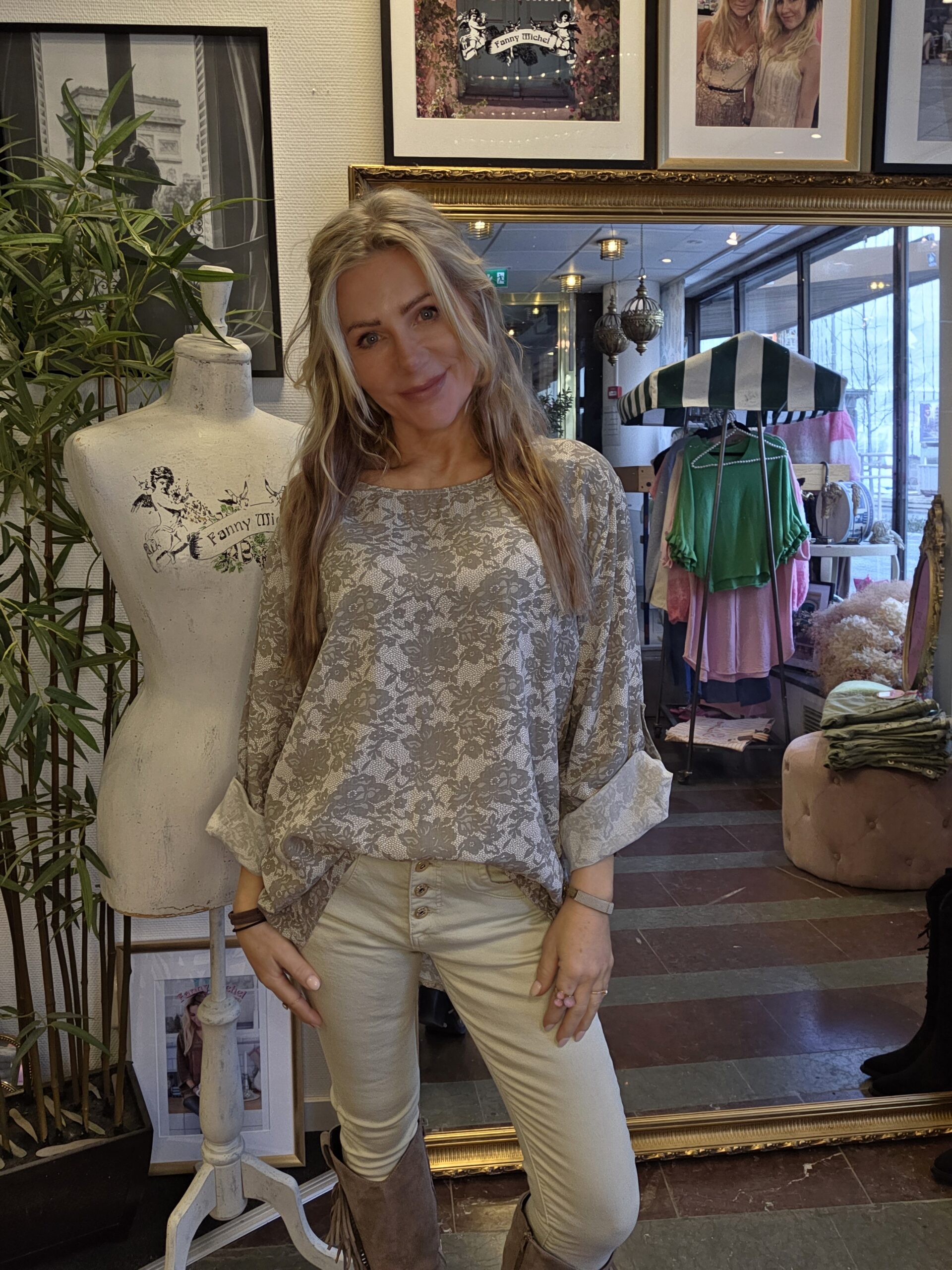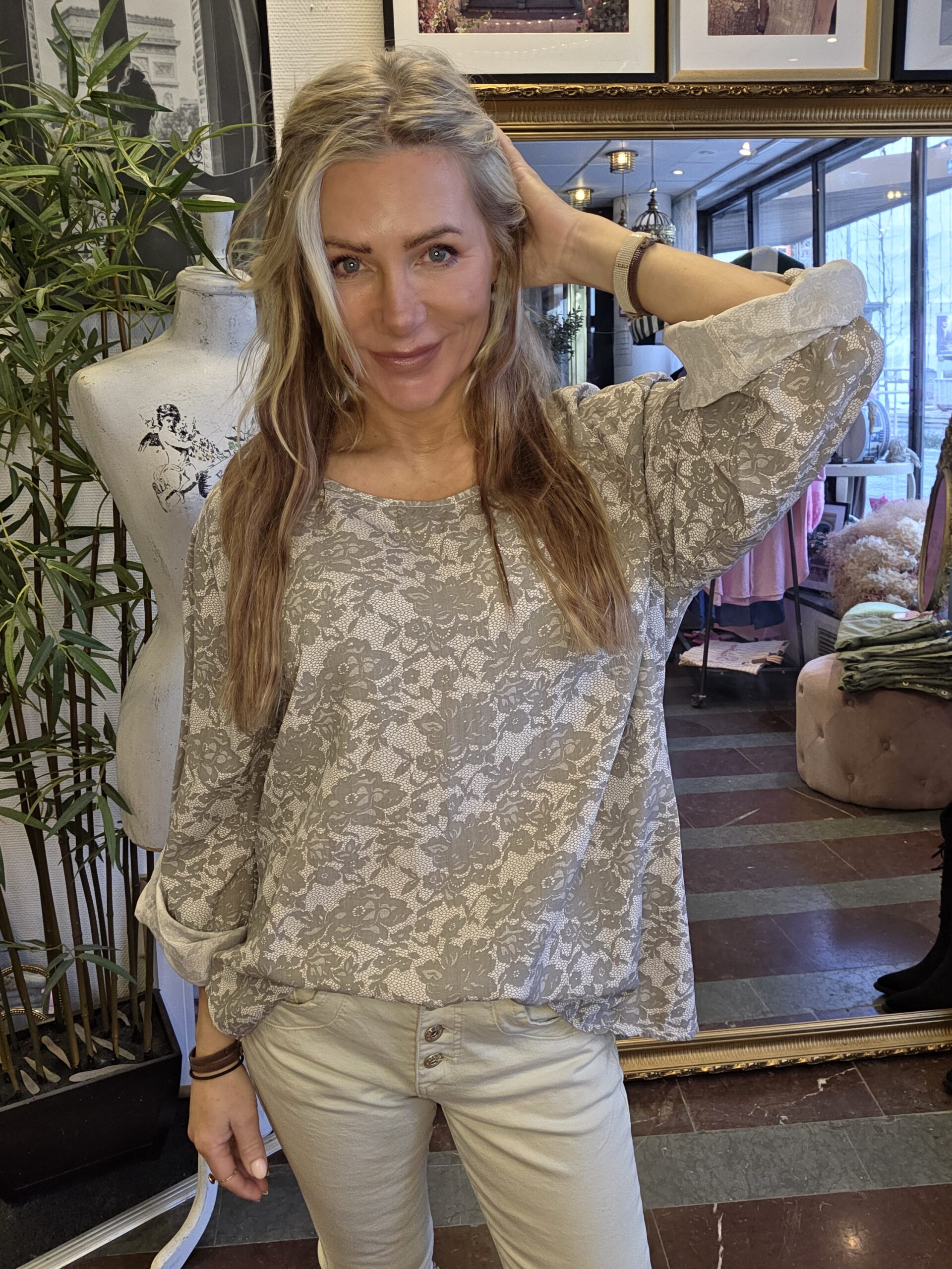 Uppvikta ärmar som fästs med en knapp. Blusen är längre bak och kortare fram. Fanny Michels egen design med noga utvalda modeller och material. Tillverkade i Italien. Mått på storleken: Onesize • Armhåla till armhåla omkrets: ca 124 cm • Längd axel och ner: Fram: ca 68 cm, bak: ca 75 cm ———————————————————————— Onesize, passar uppskattningsvis XS/34 – XL/42 Modellen på bilden är ca 163 cm lång.Passar uppskattningsvis XS/34-XL/42.