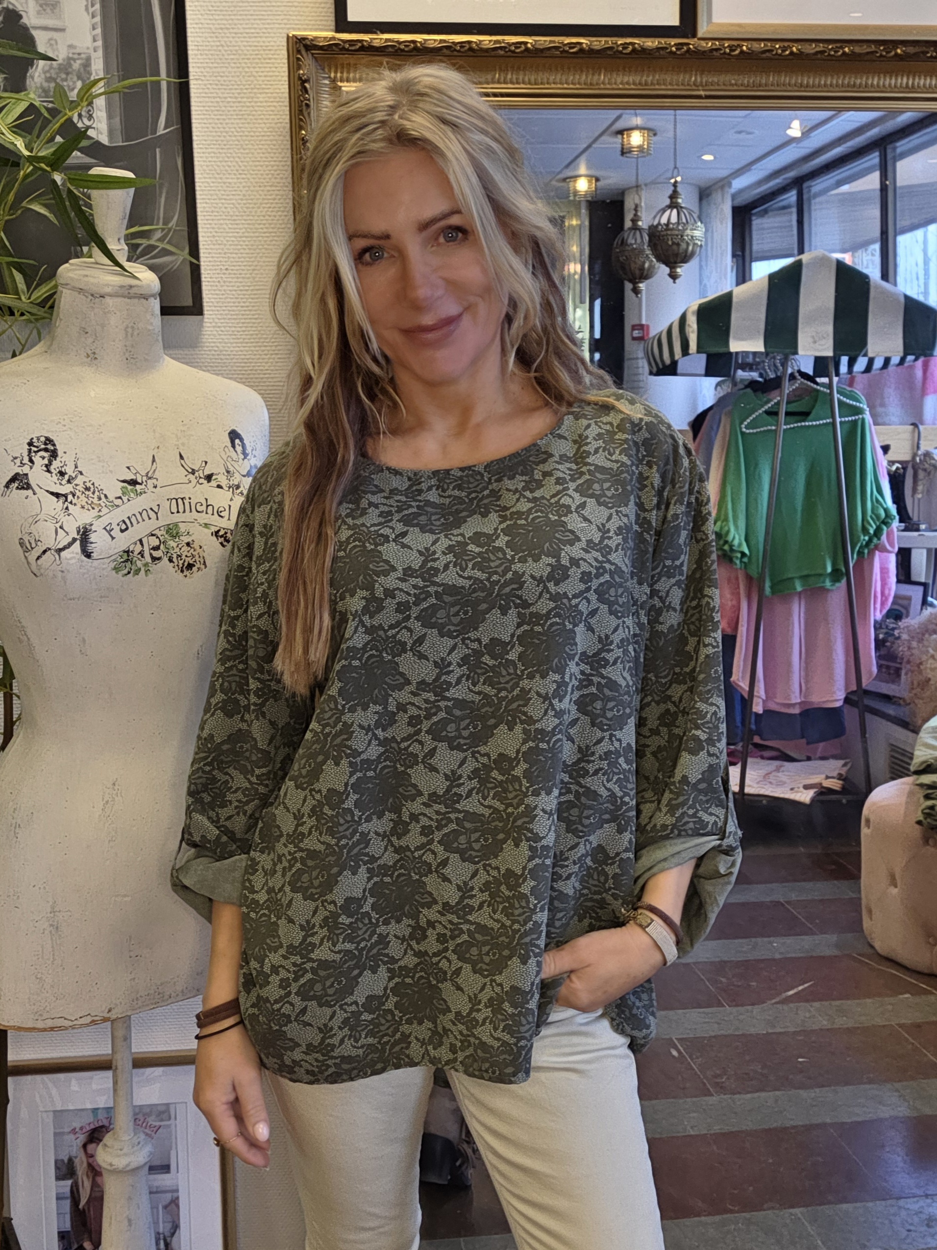 Uppvikta ärmar som fästs med en knapp. Blusen är längre bak och kortare fram. Fanny Michels egen design med noga utvalda modeller och material. Tillverkade i Italien. Mått på storleken: Onesize • Armhåla till armhåla omkrets: ca 124 cm • Längd axel och ner: Fram: ca 68 cm, bak: ca 75 cm ———————————————————————— Onesize, passar uppskattningsvis XS/34 – XL/42 Modellen på bilden är ca 163 cm lång.Passar uppskattningsvis XS/34-XL/42.