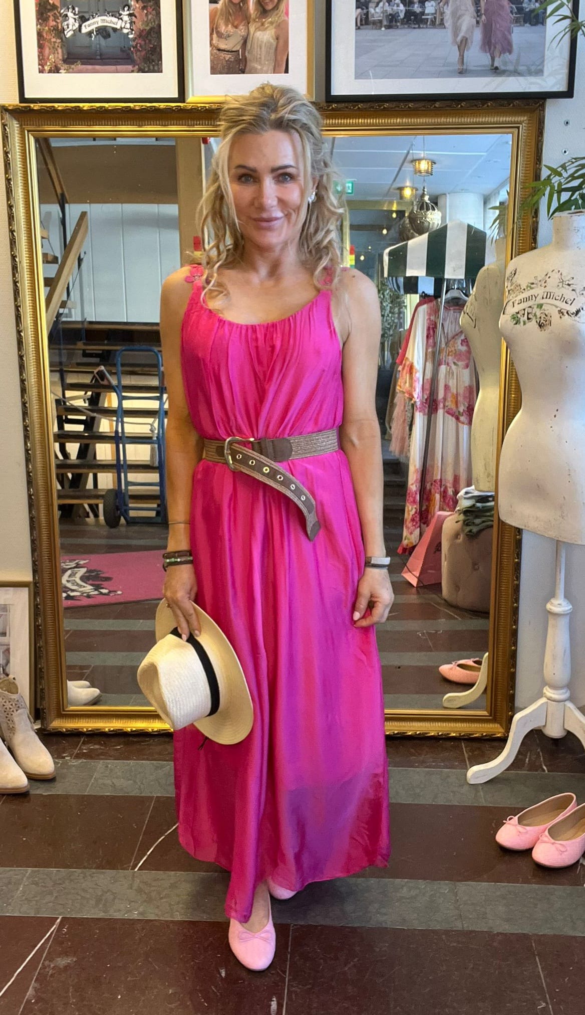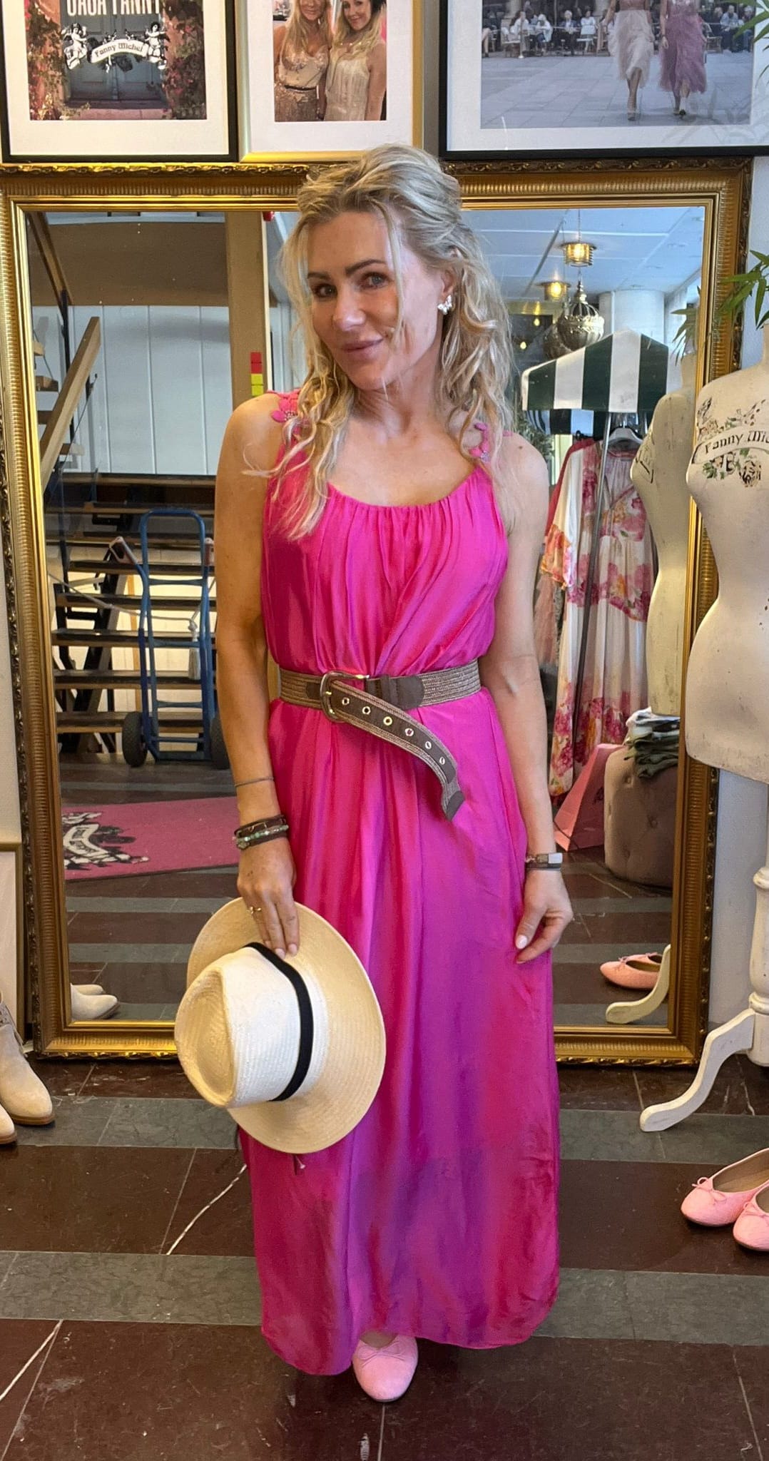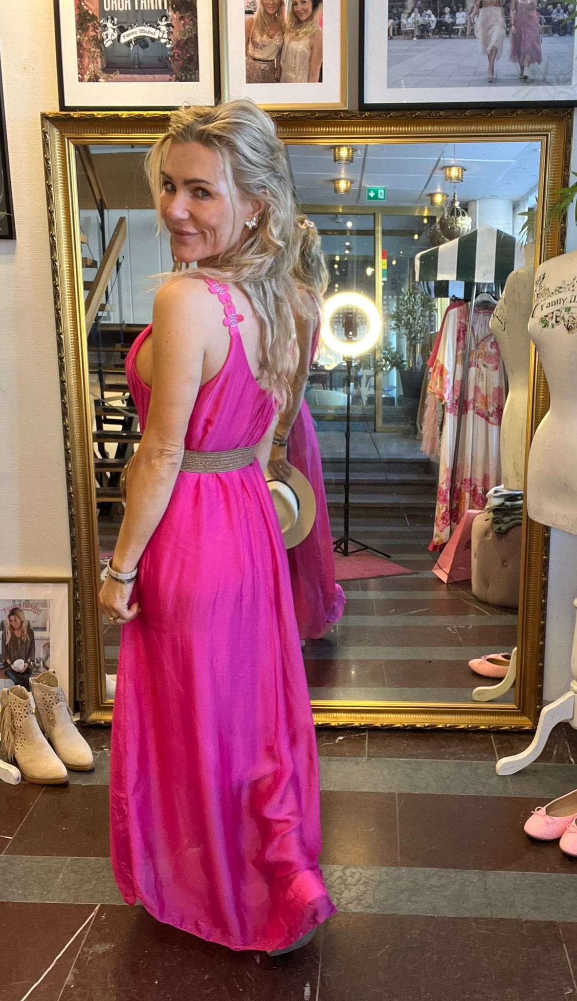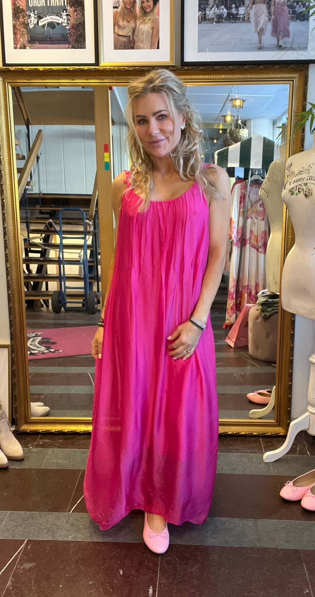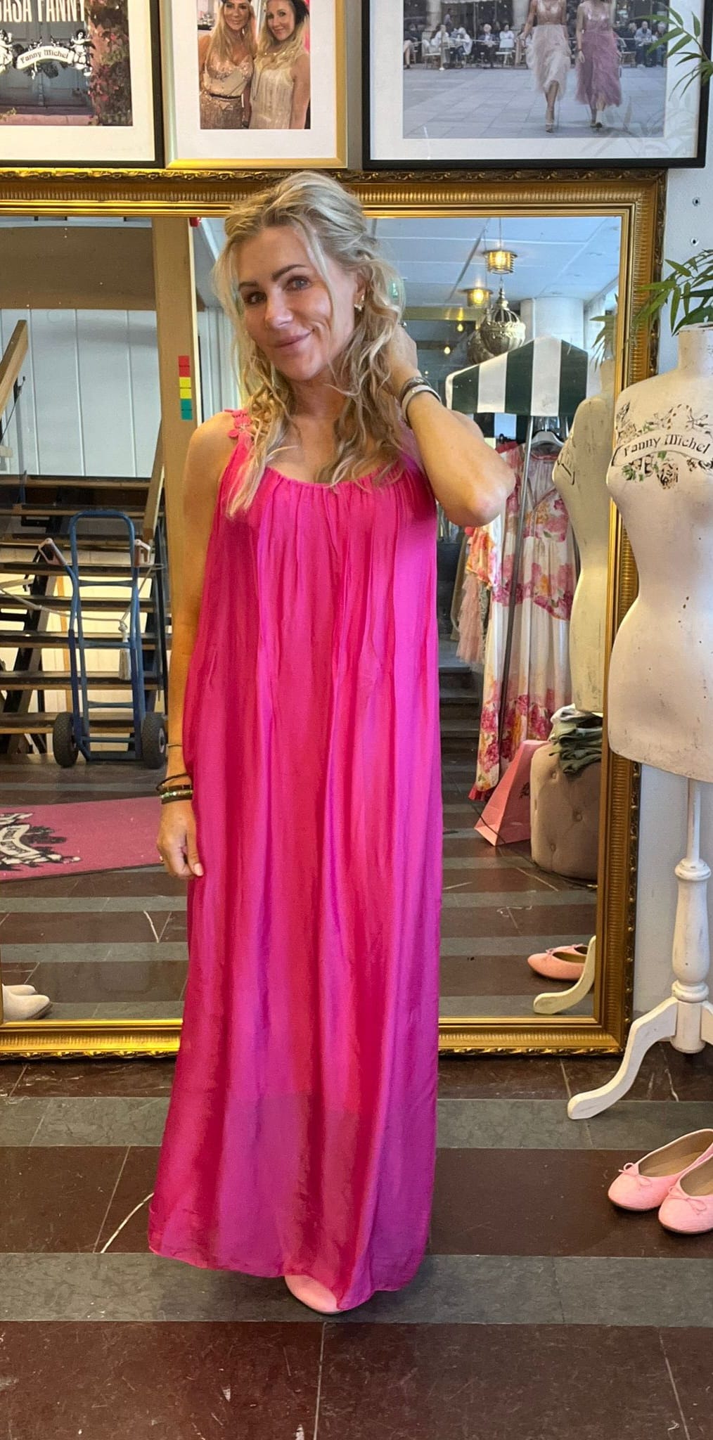 Stretchy gathers at the front and back of the neckline. Sew-on underdress in soft fabric. Size measurements: Onesize • Armpit to armpit circumference: approx. 100 cm, can be stretched a little more. • Length: approx. 138 cm. ——————————————————————– The model is approx. 163 cm tall. The dress is onesize, fits approximately XS/34 – L/40.Fits approximately XS/34-L/40