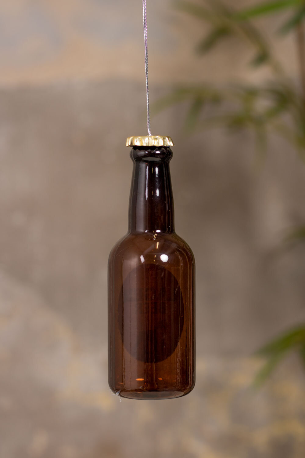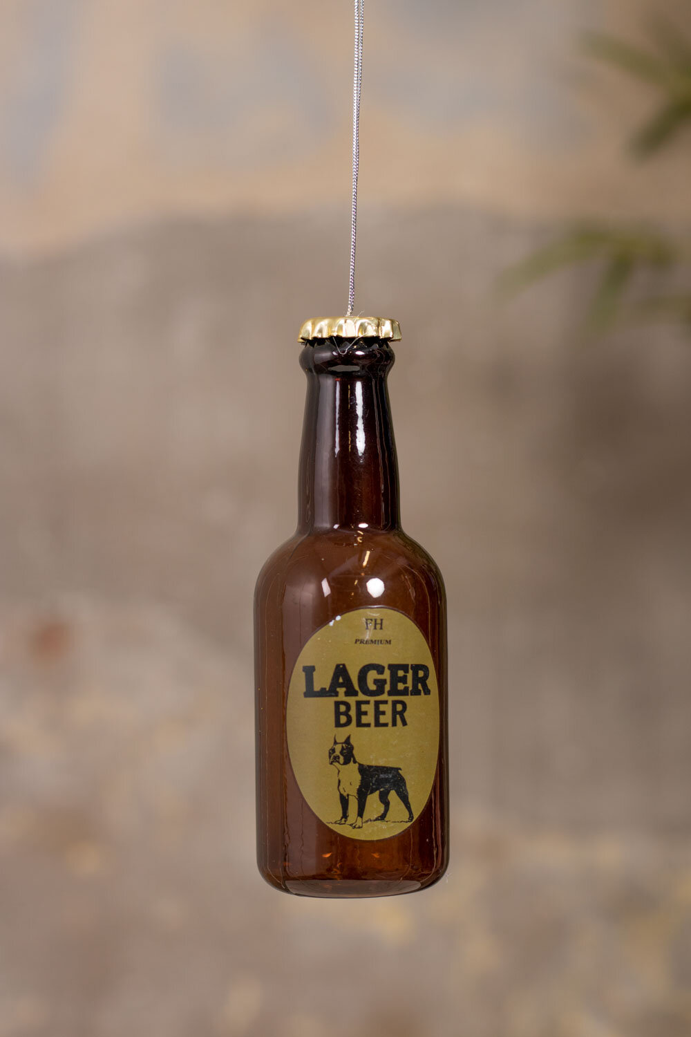 Cheeky Christmas tree ball that is shaped like a glass bottle with the text Lager beer on it!