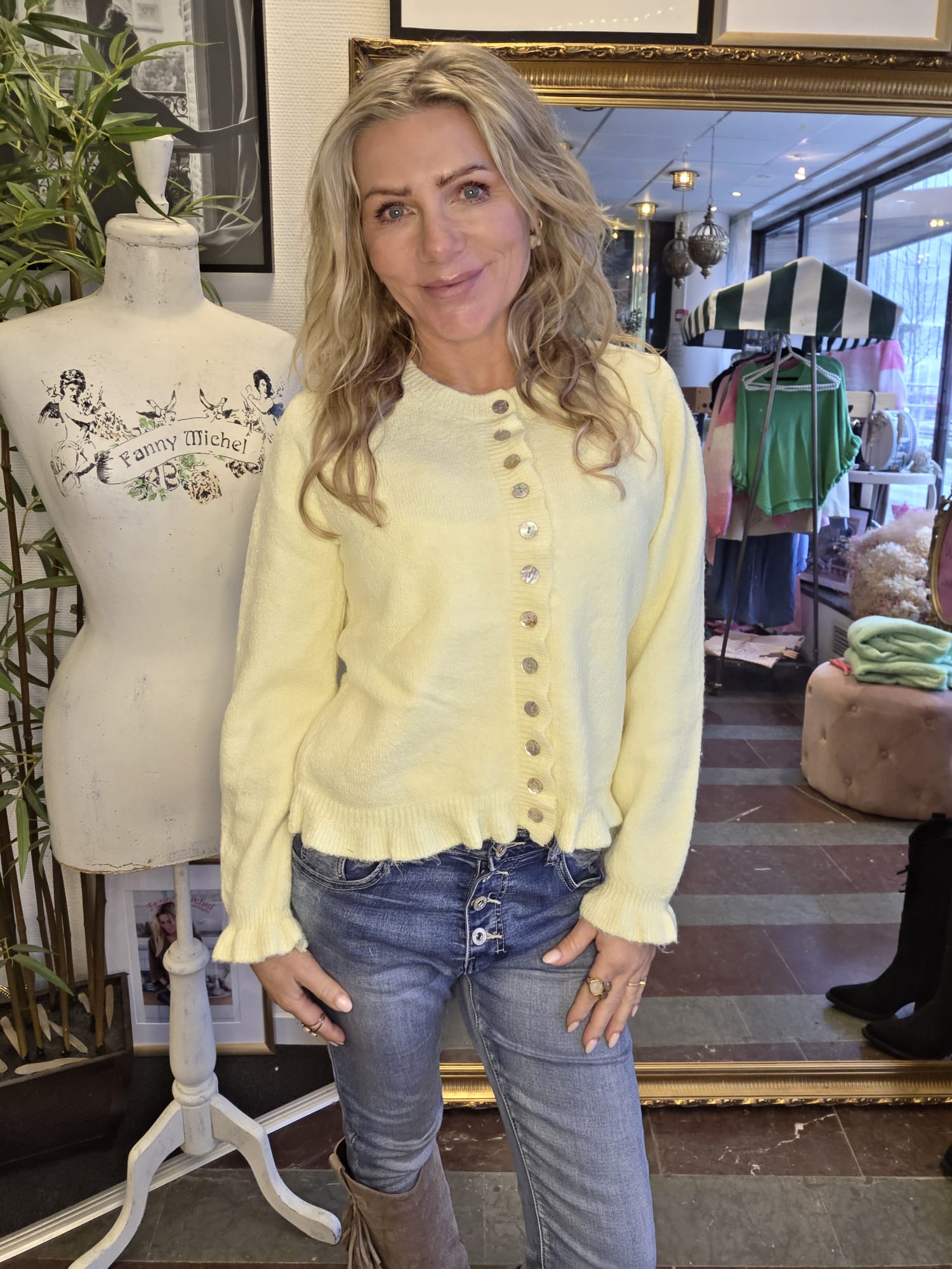Super nice cardigan with ruffle details and pearl-colored buttons!