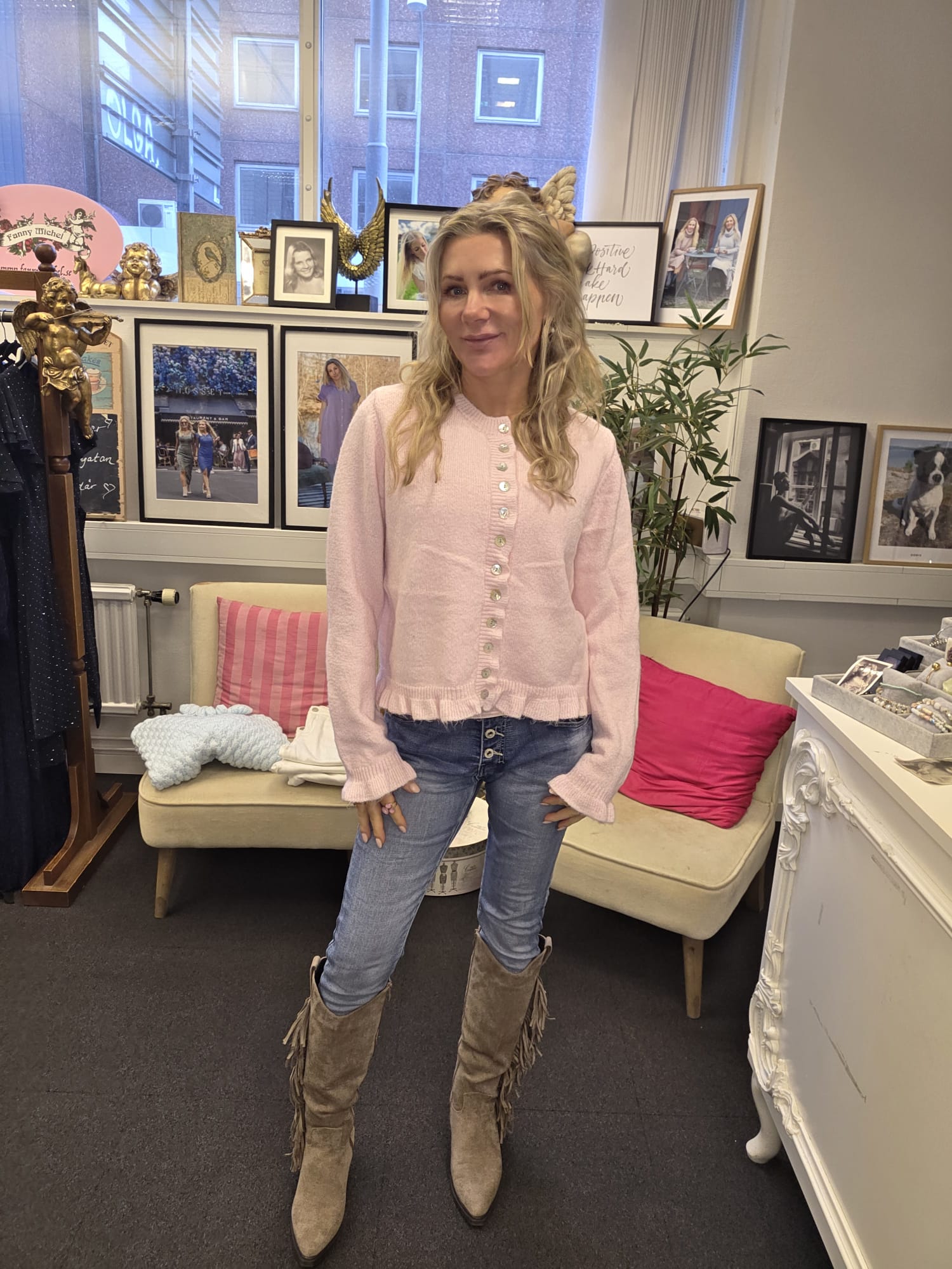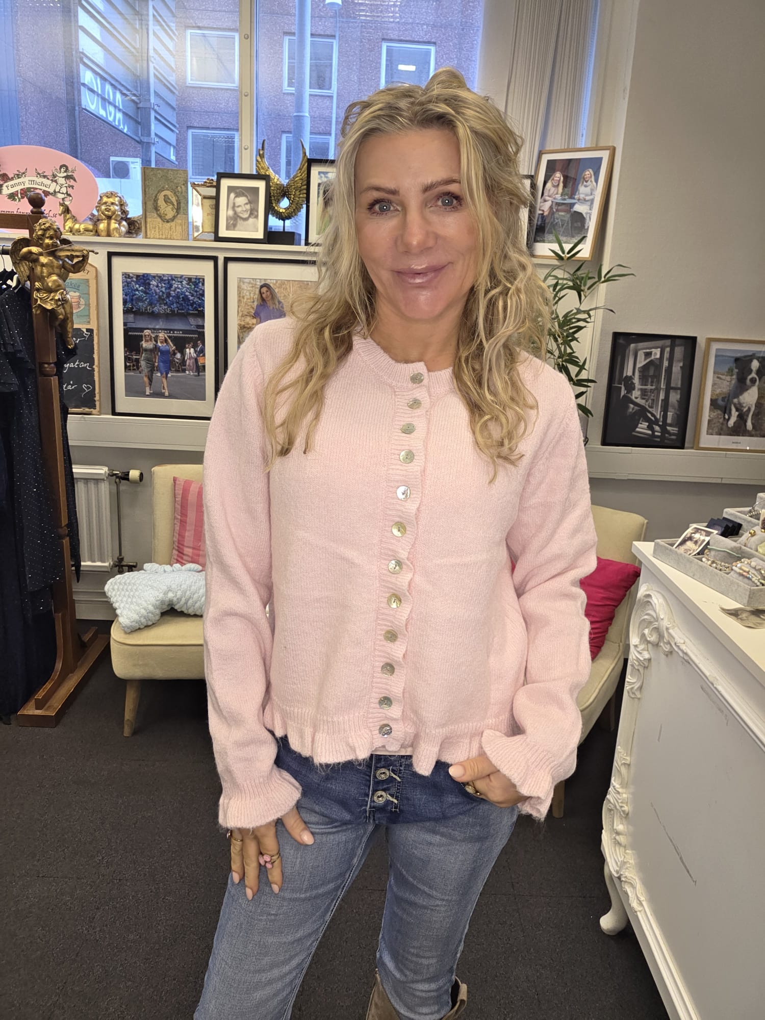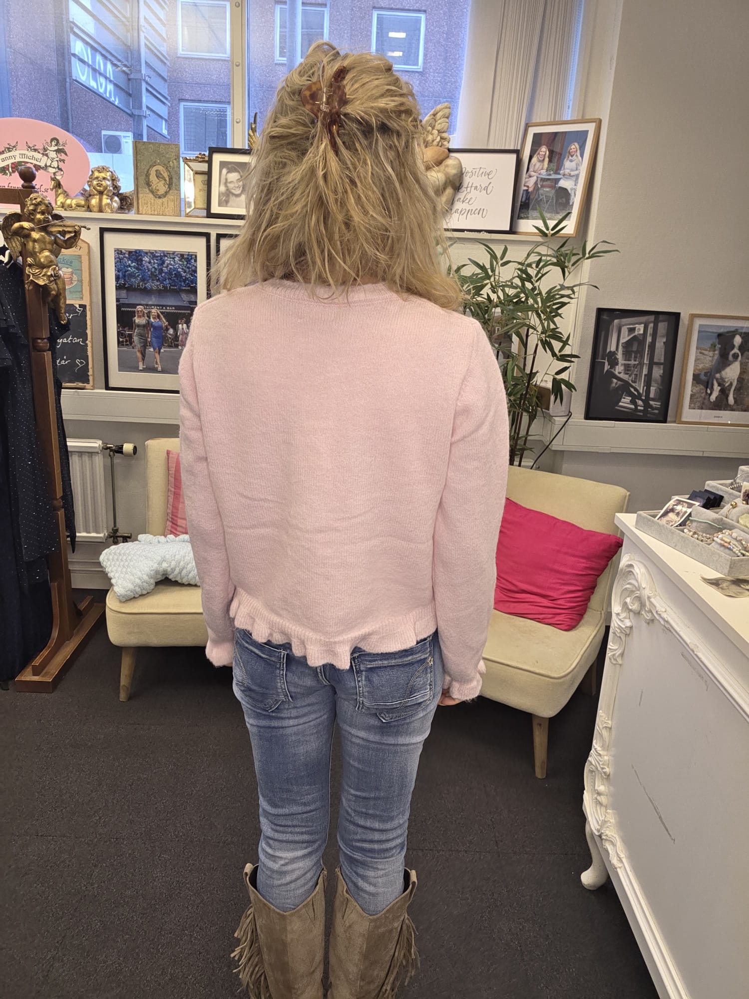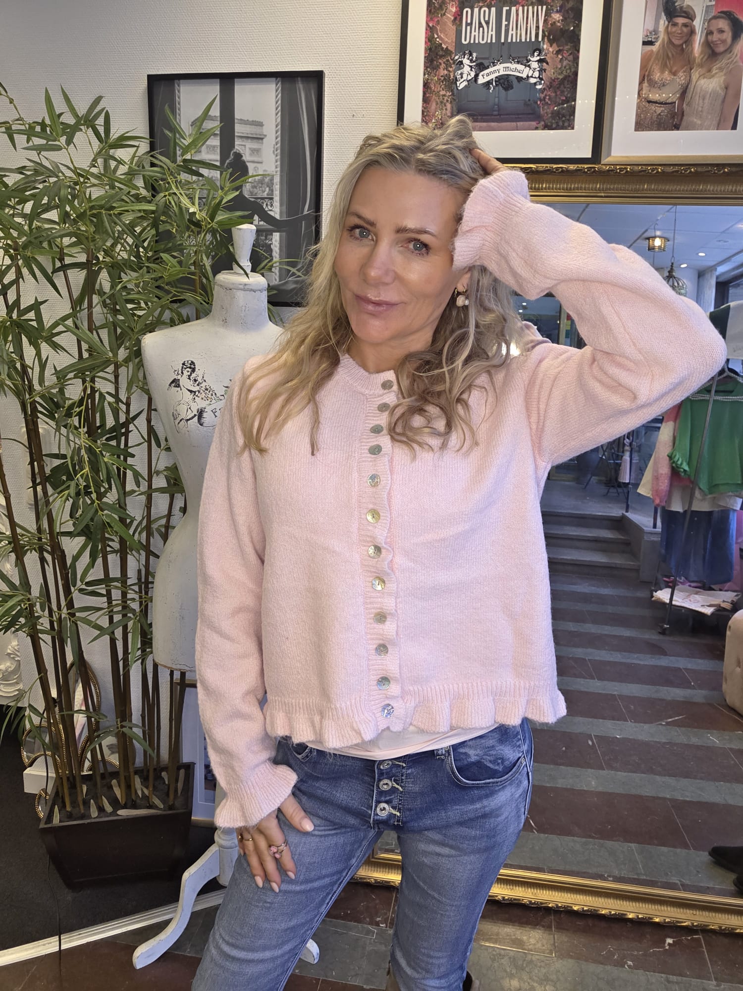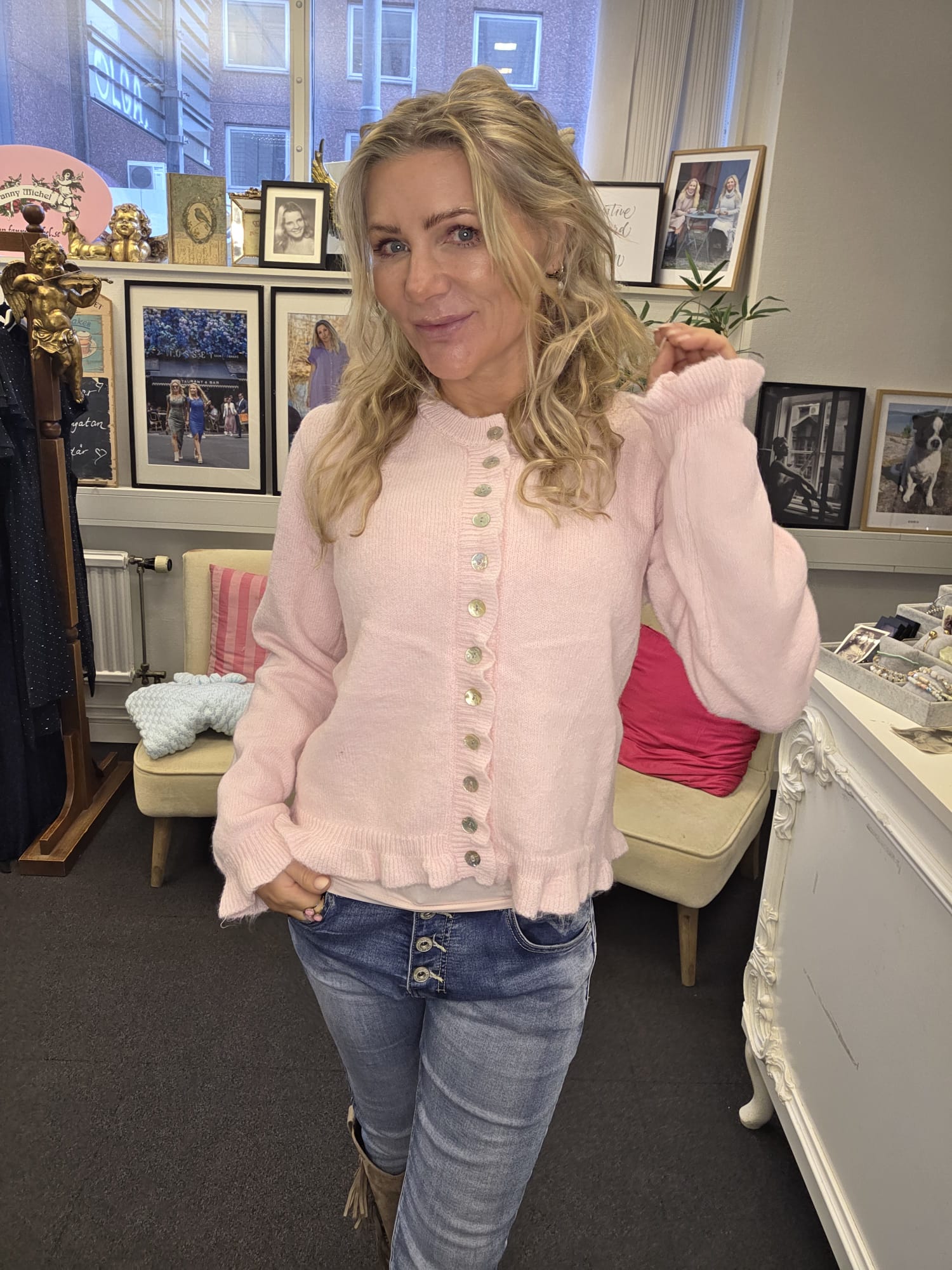 Super nice cardigan with ruffle details and pearl-colored buttons!