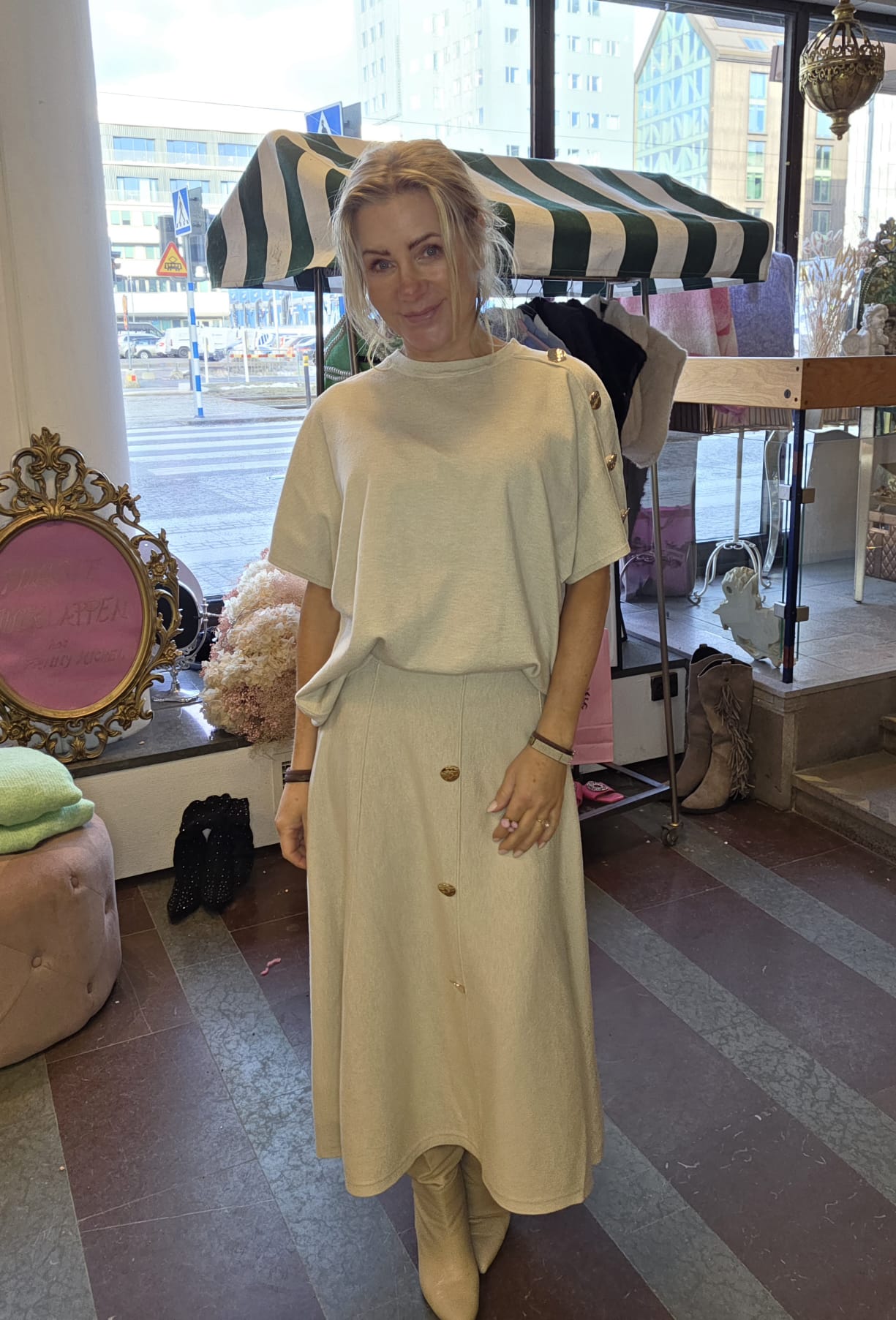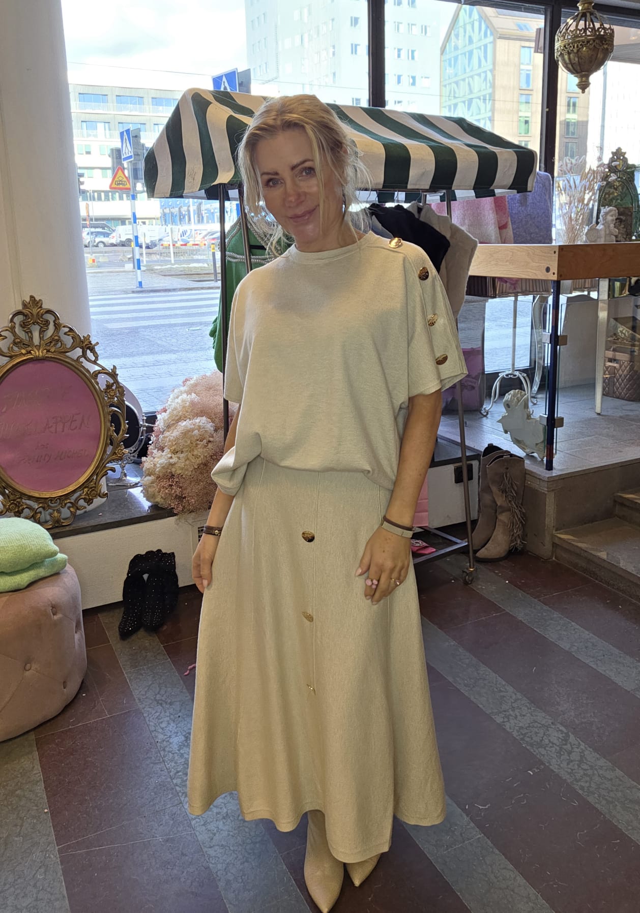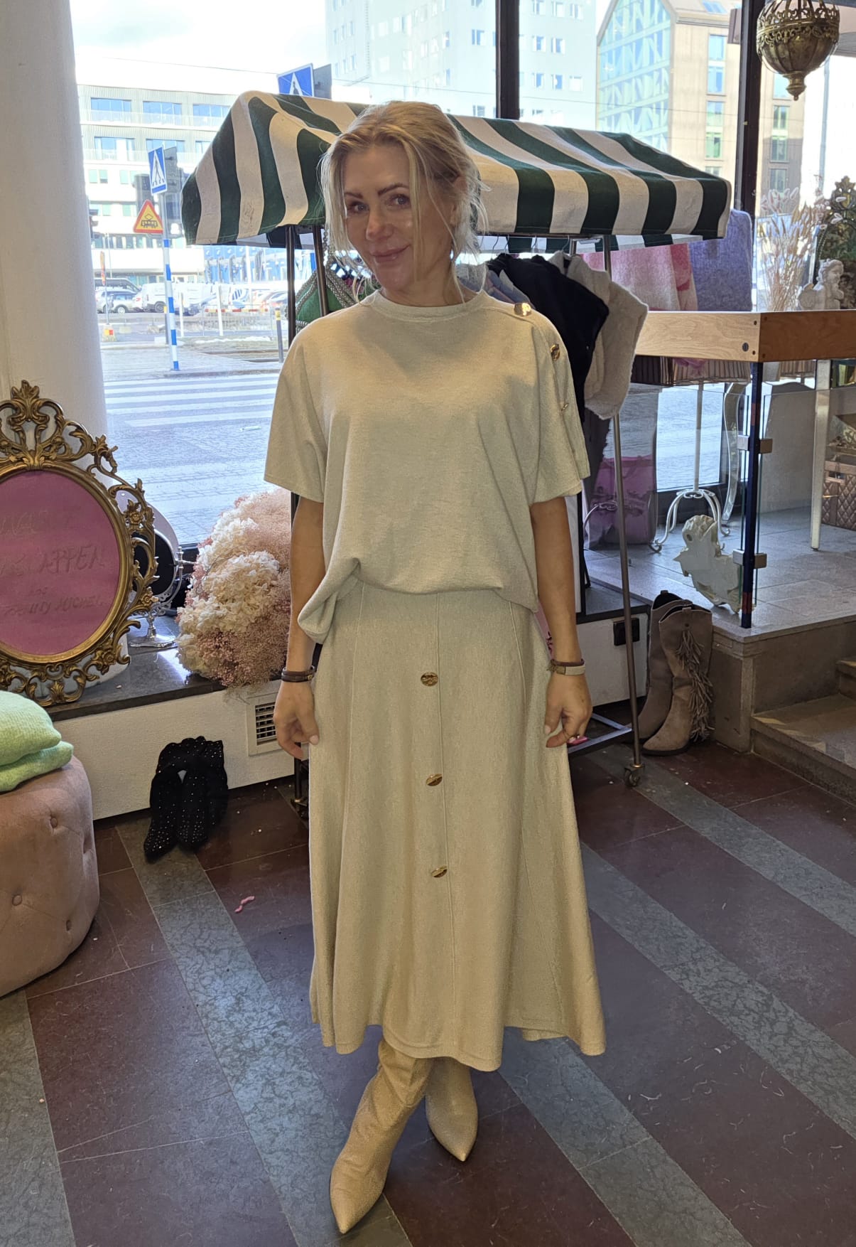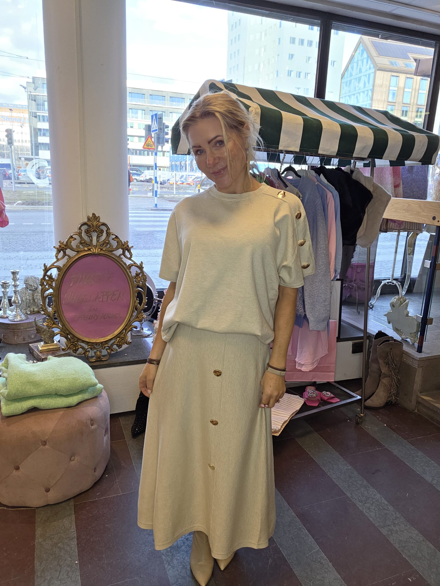 Finstickad kjol med guldknappar – Beige