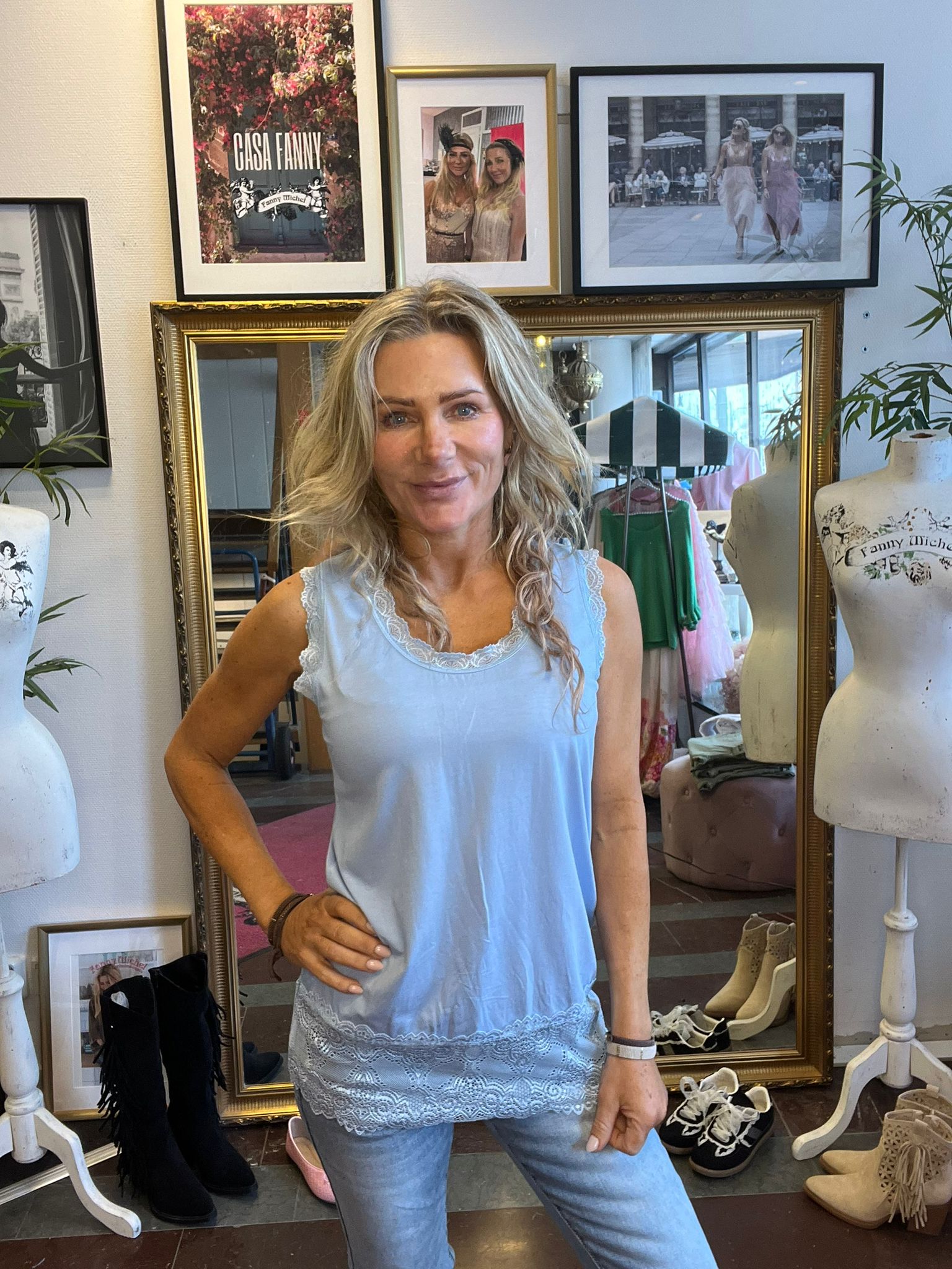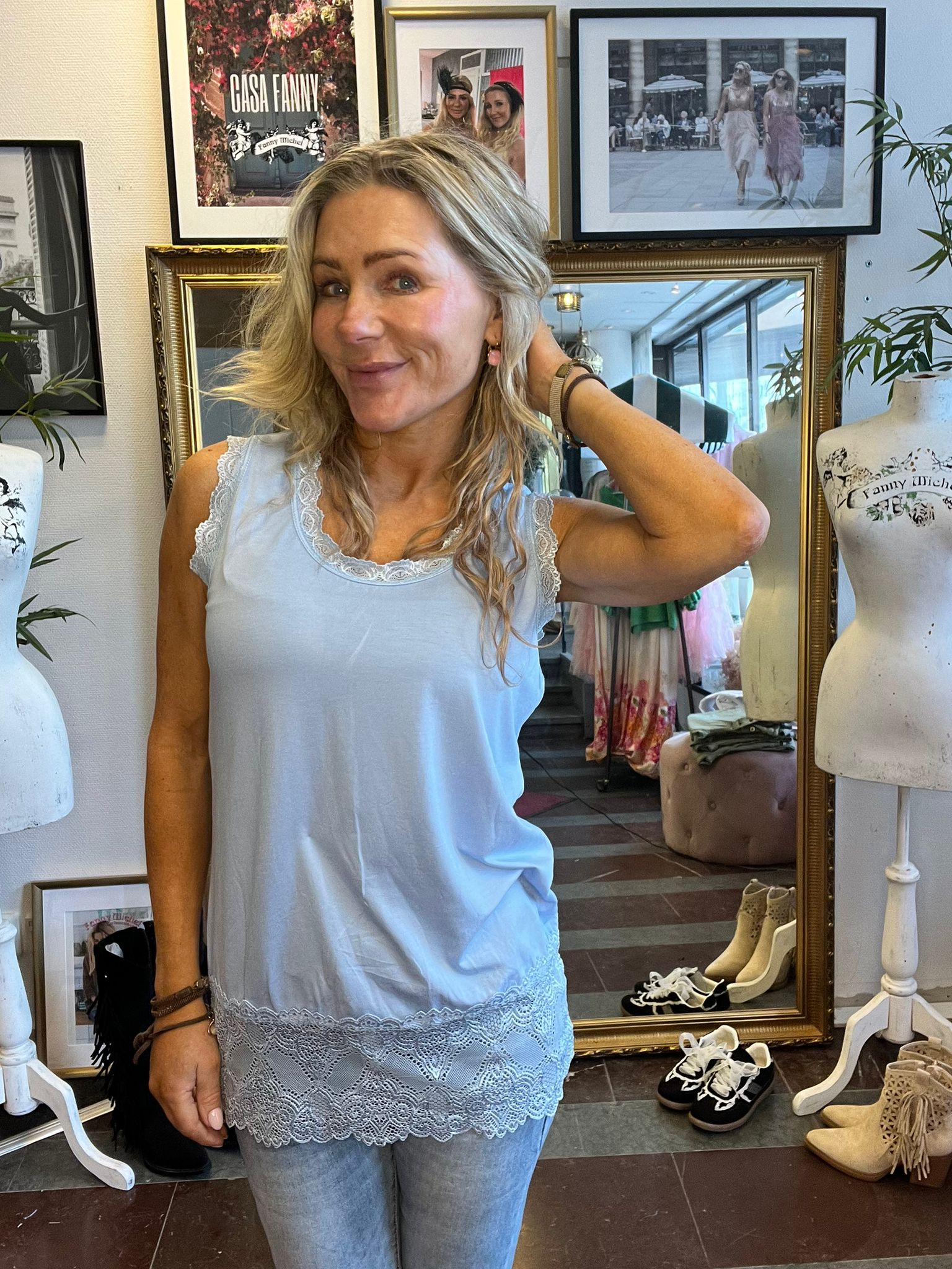 Fint stretchigt linne med spetskanter runt hals och axlar!