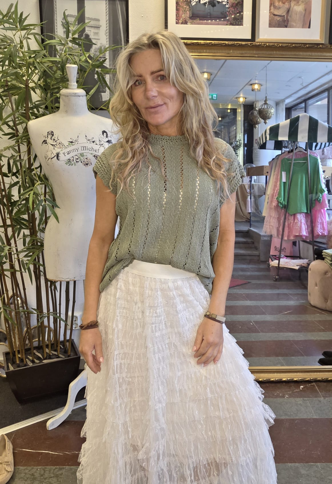 Söt virkad kant vid halsringning och längst ned på toppen.