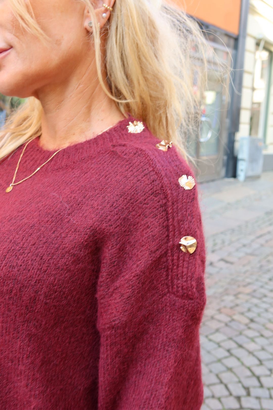 Lisen -Stickad klänning med guldknappar – Bordo