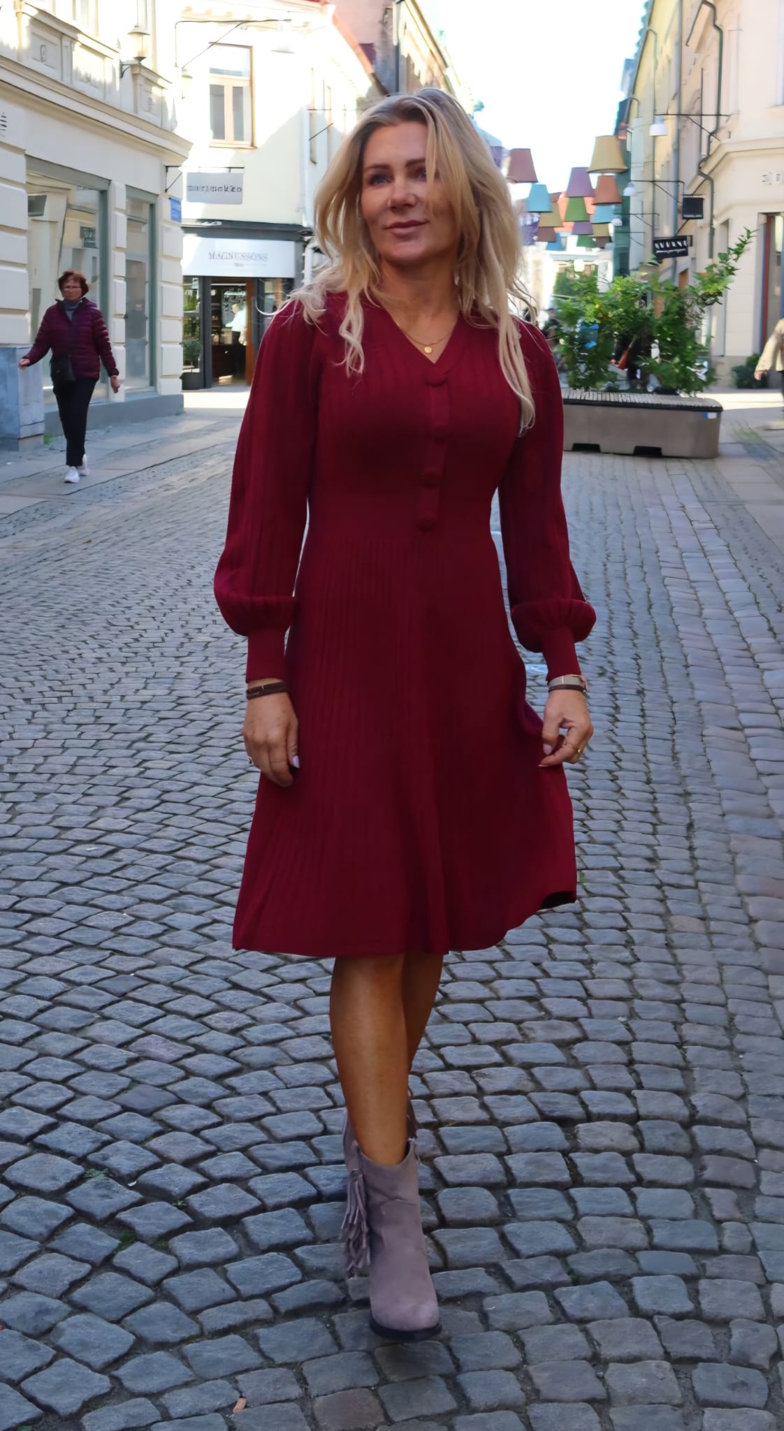 Maria stickad klänning – Knappar – Bordo