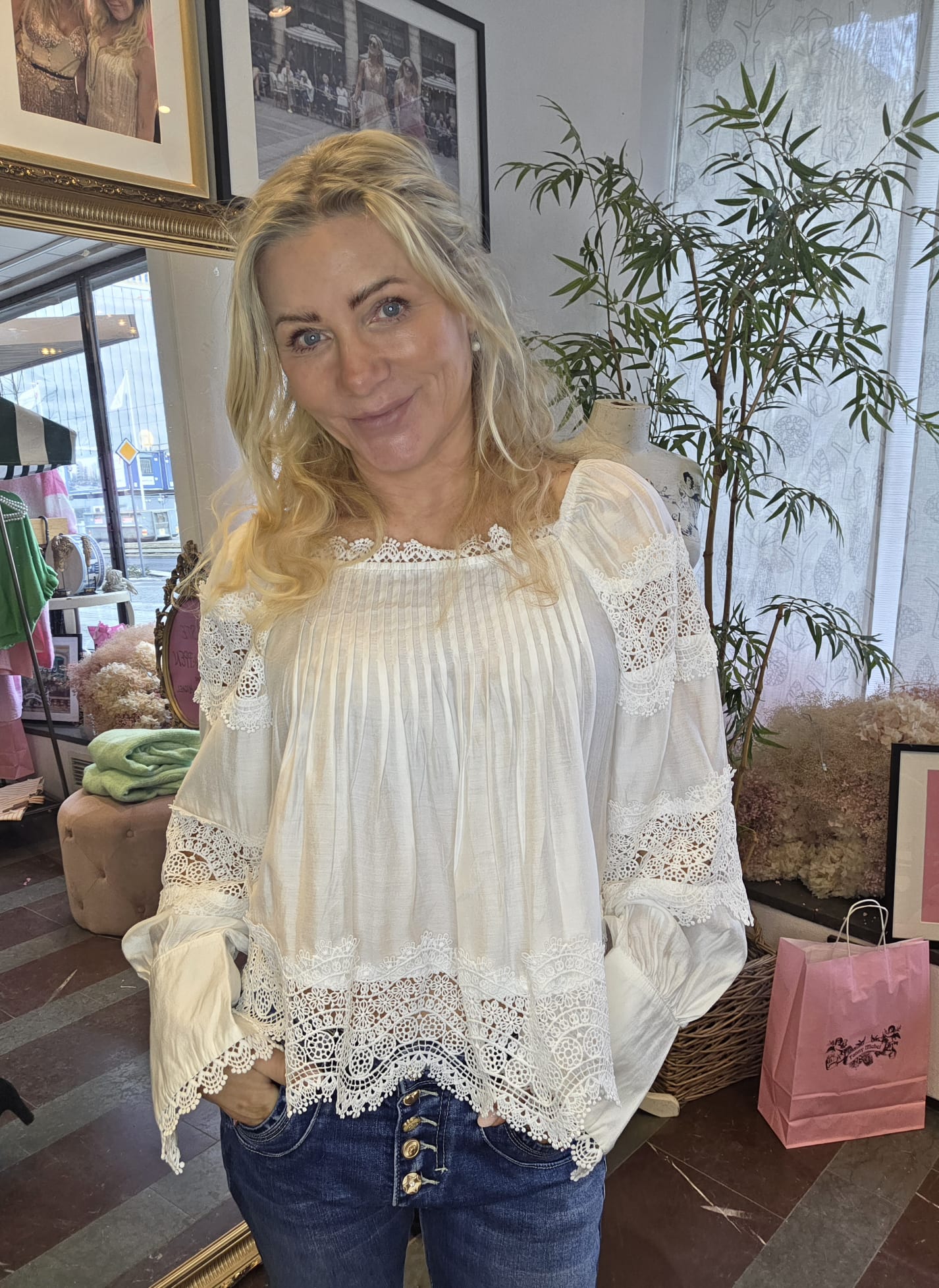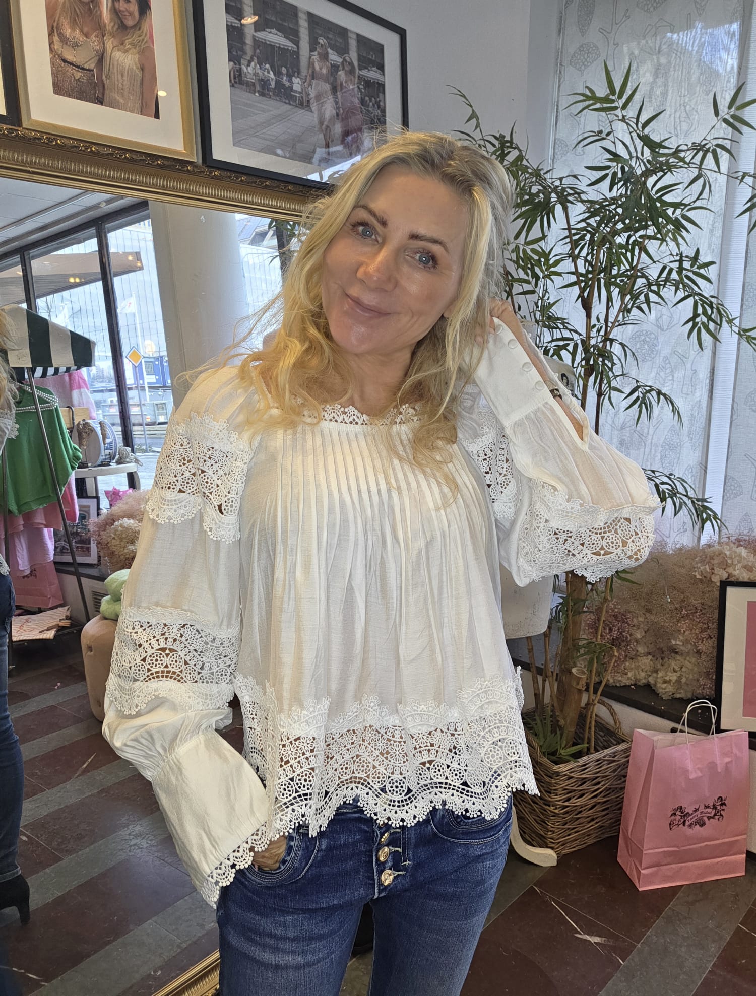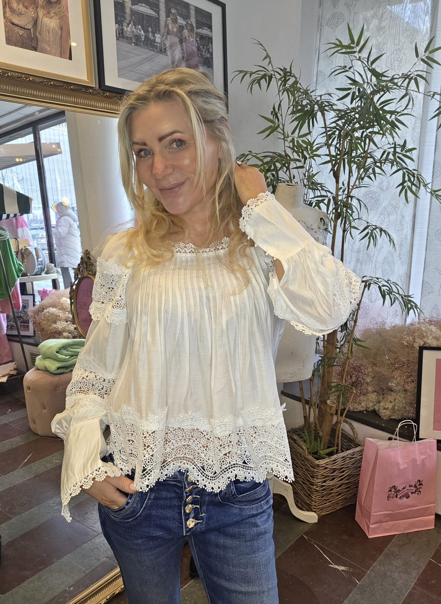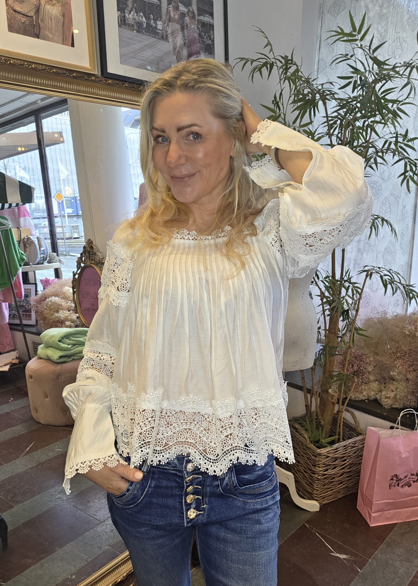 Vacker blus med spets och veckade detaljer.