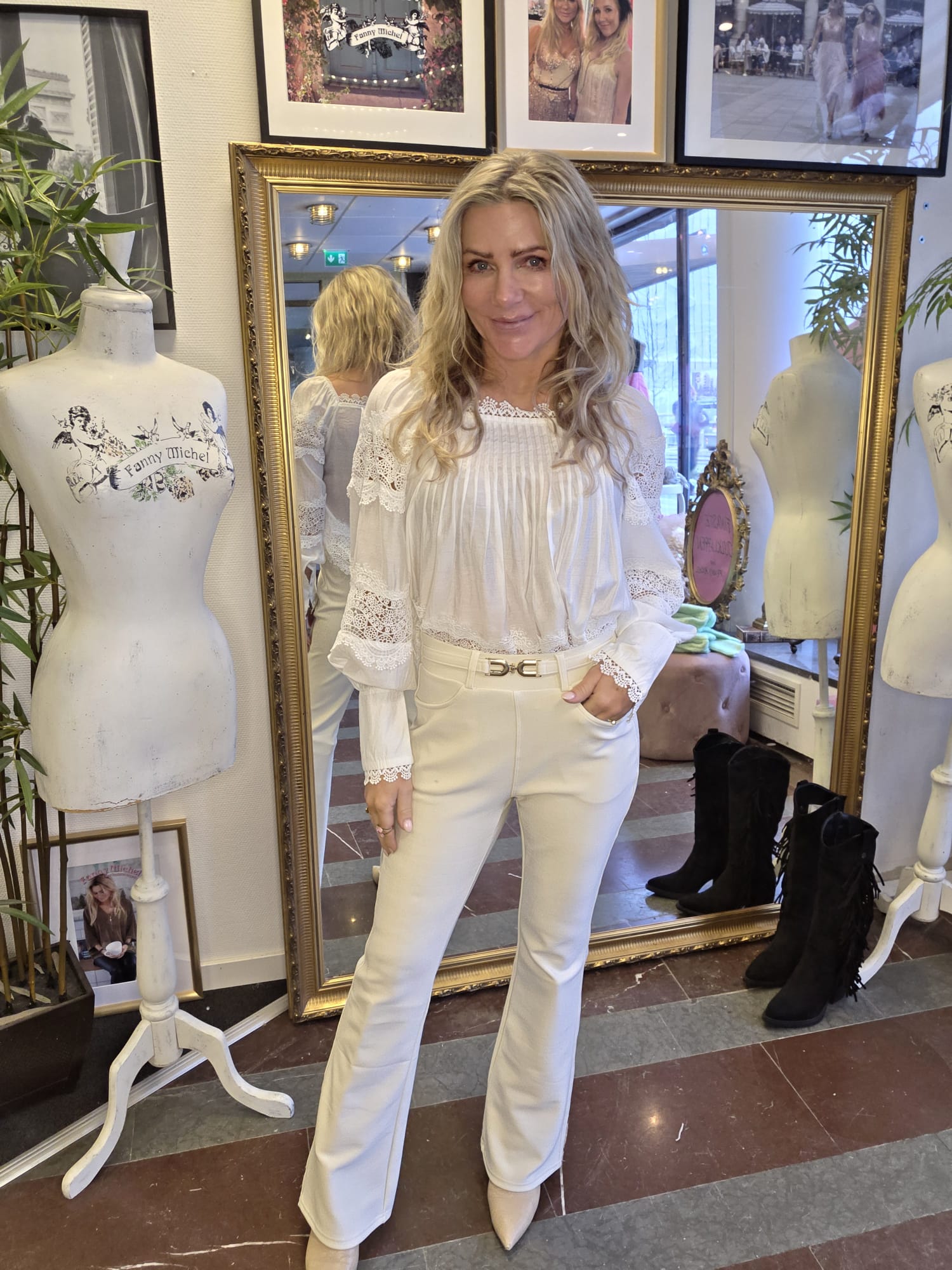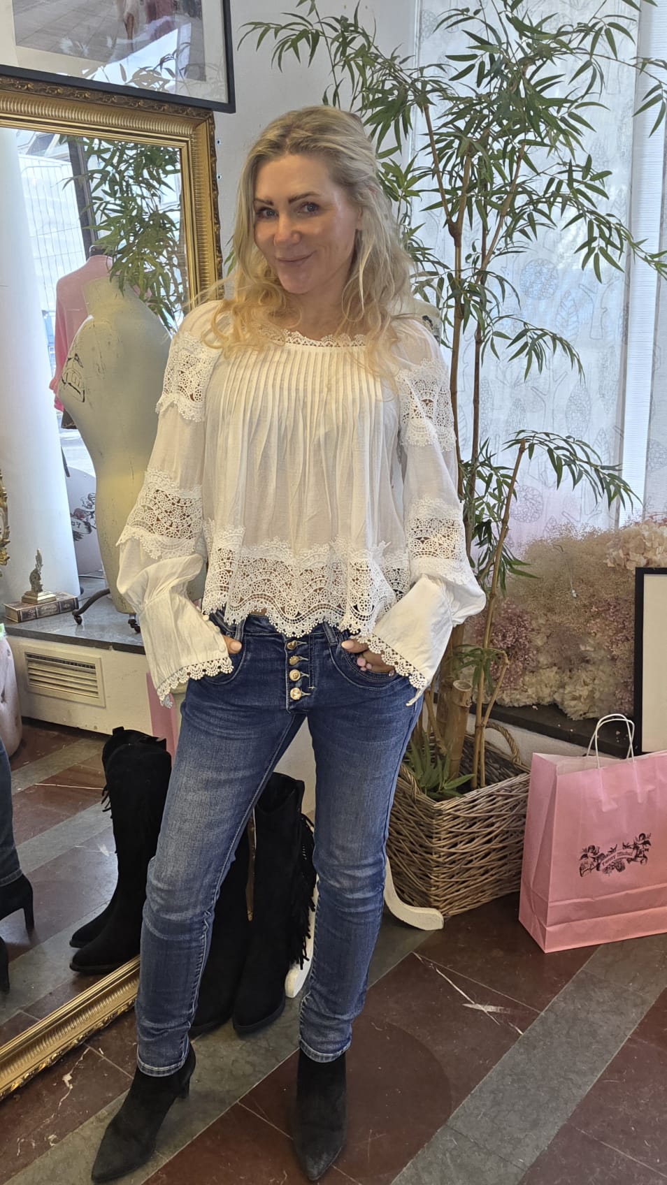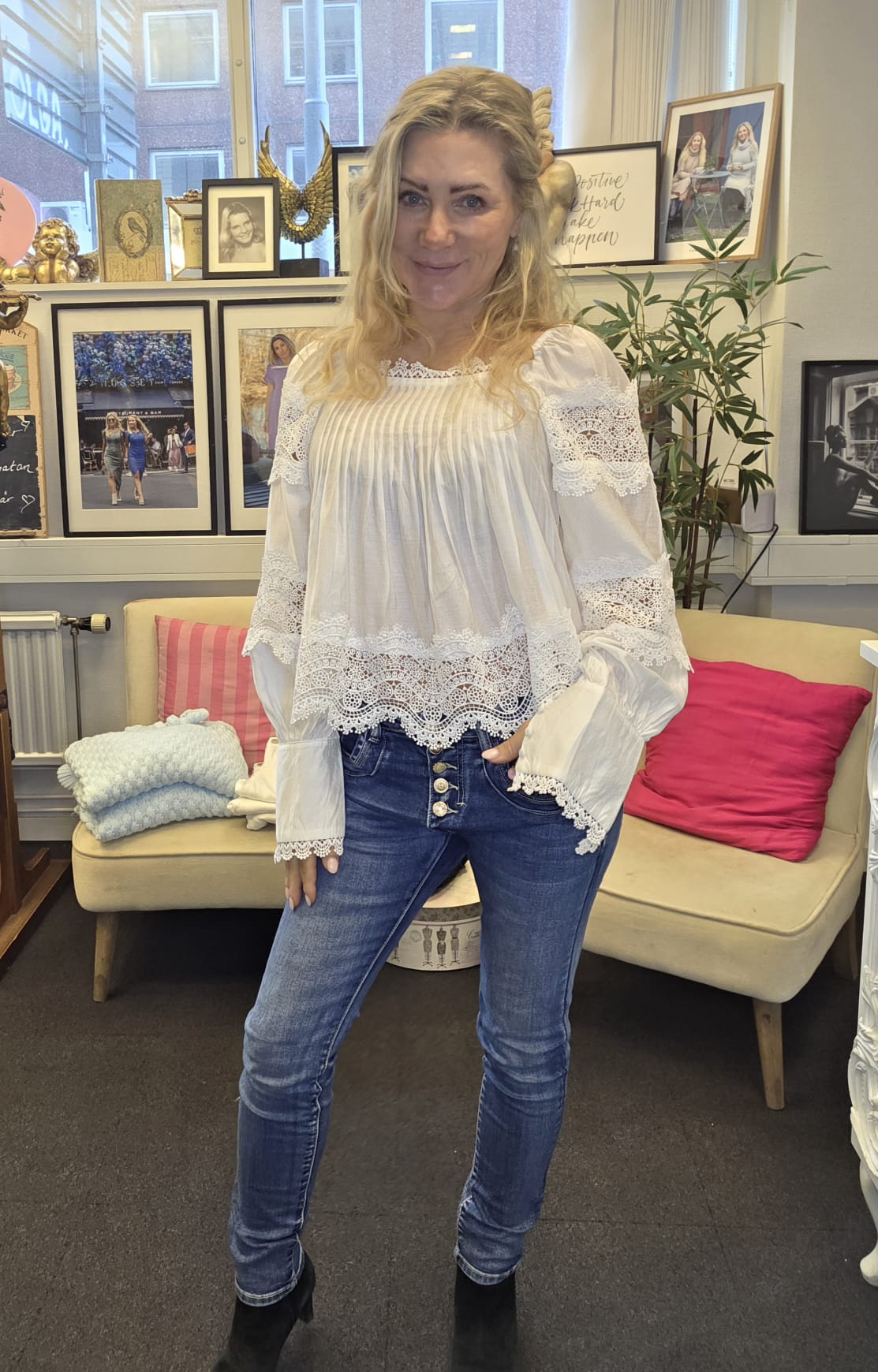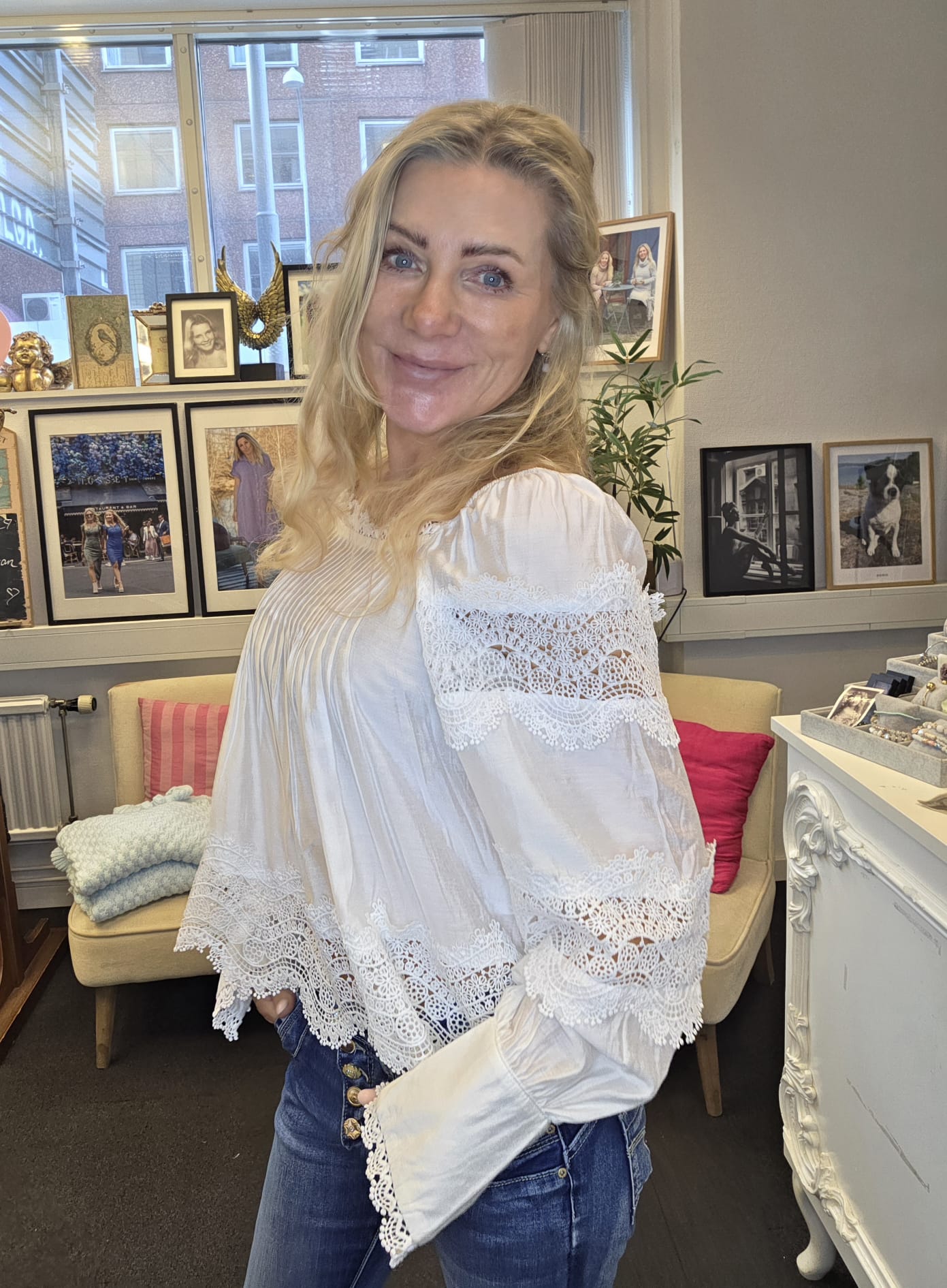 Vacker blus med spets och veckade detaljer.