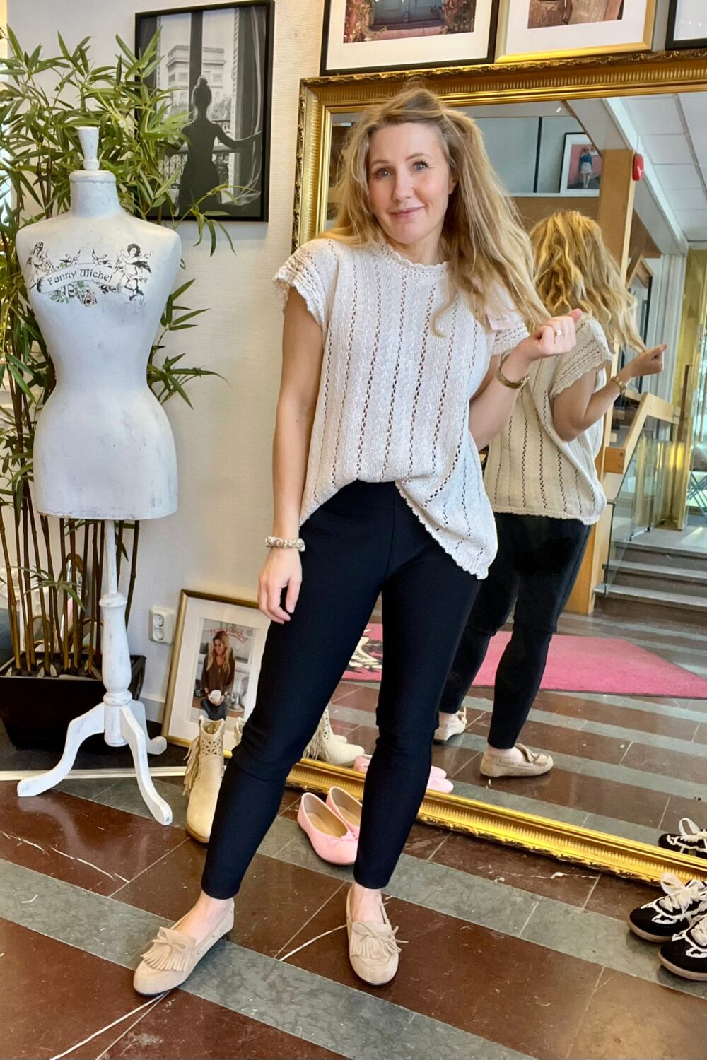 Modellen på bilden bär XS/34 och är ca 163 cm lång.