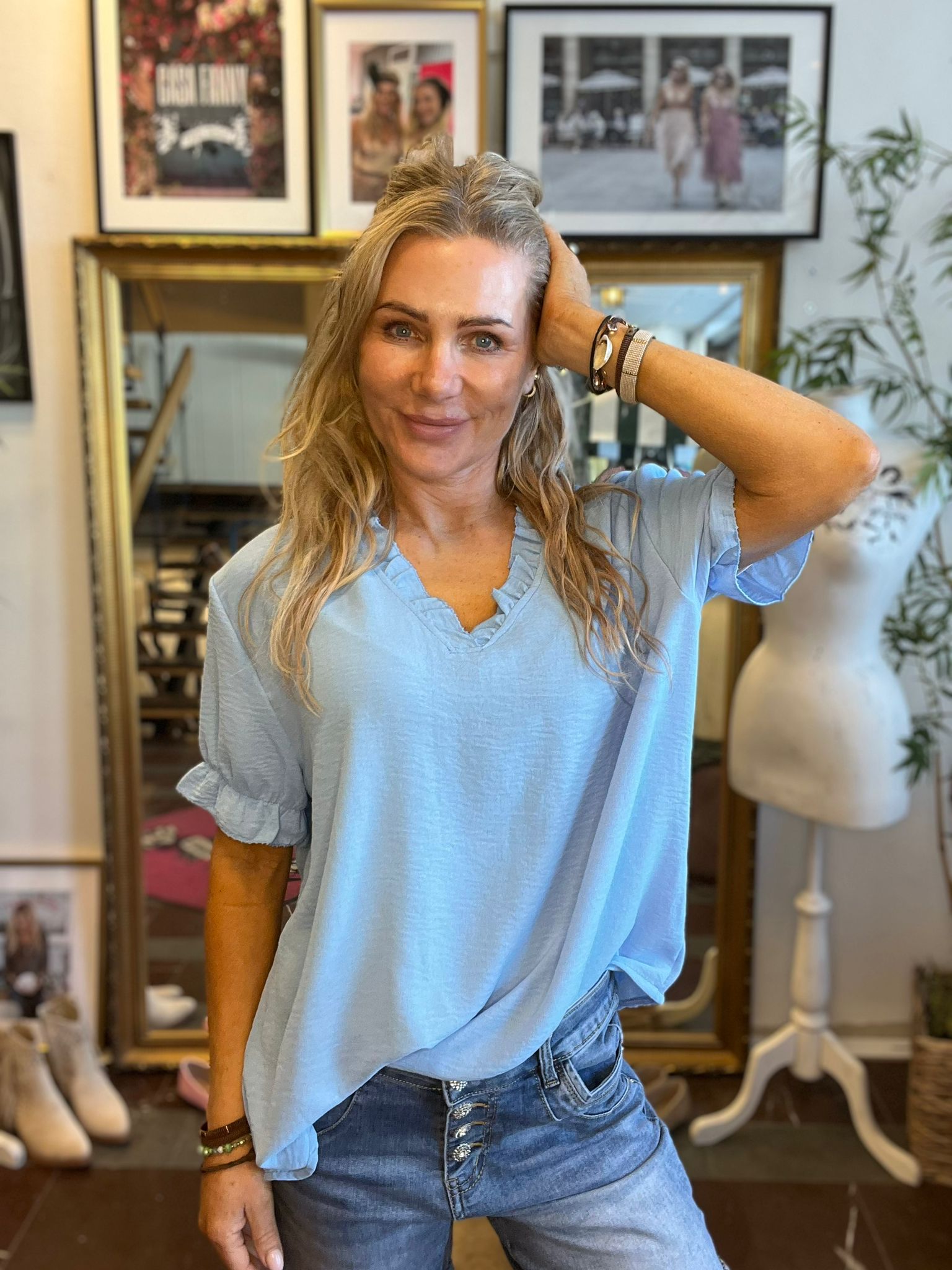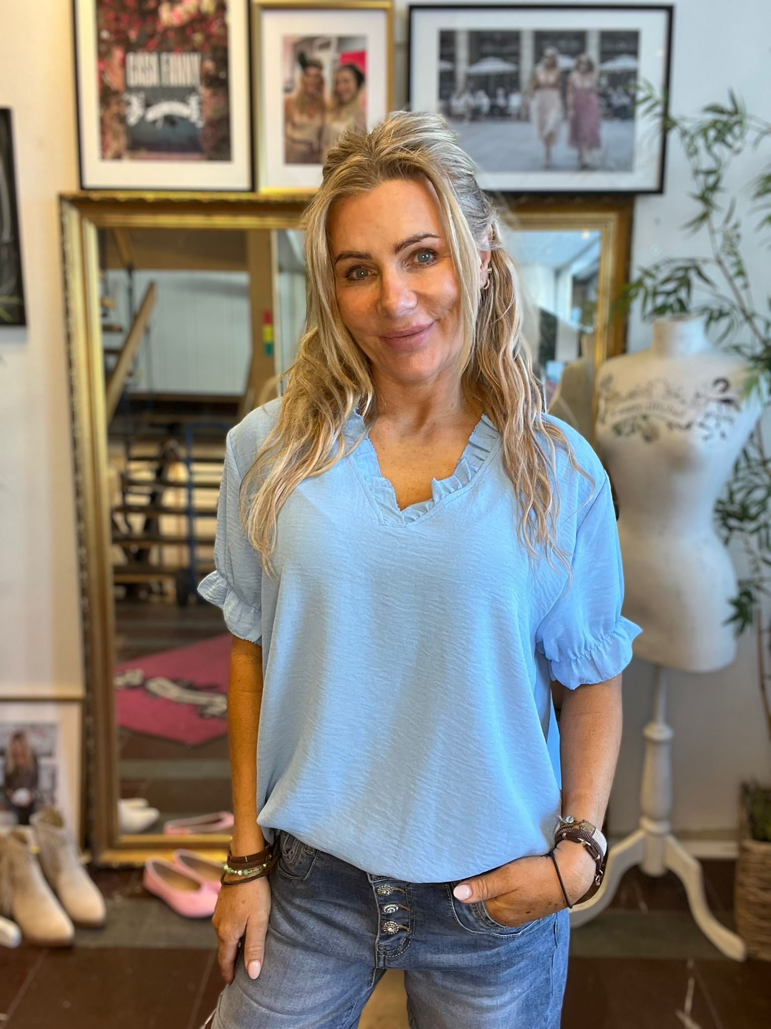 Snygg kortärmad blus med resår på ärmen som en härlig detalj!