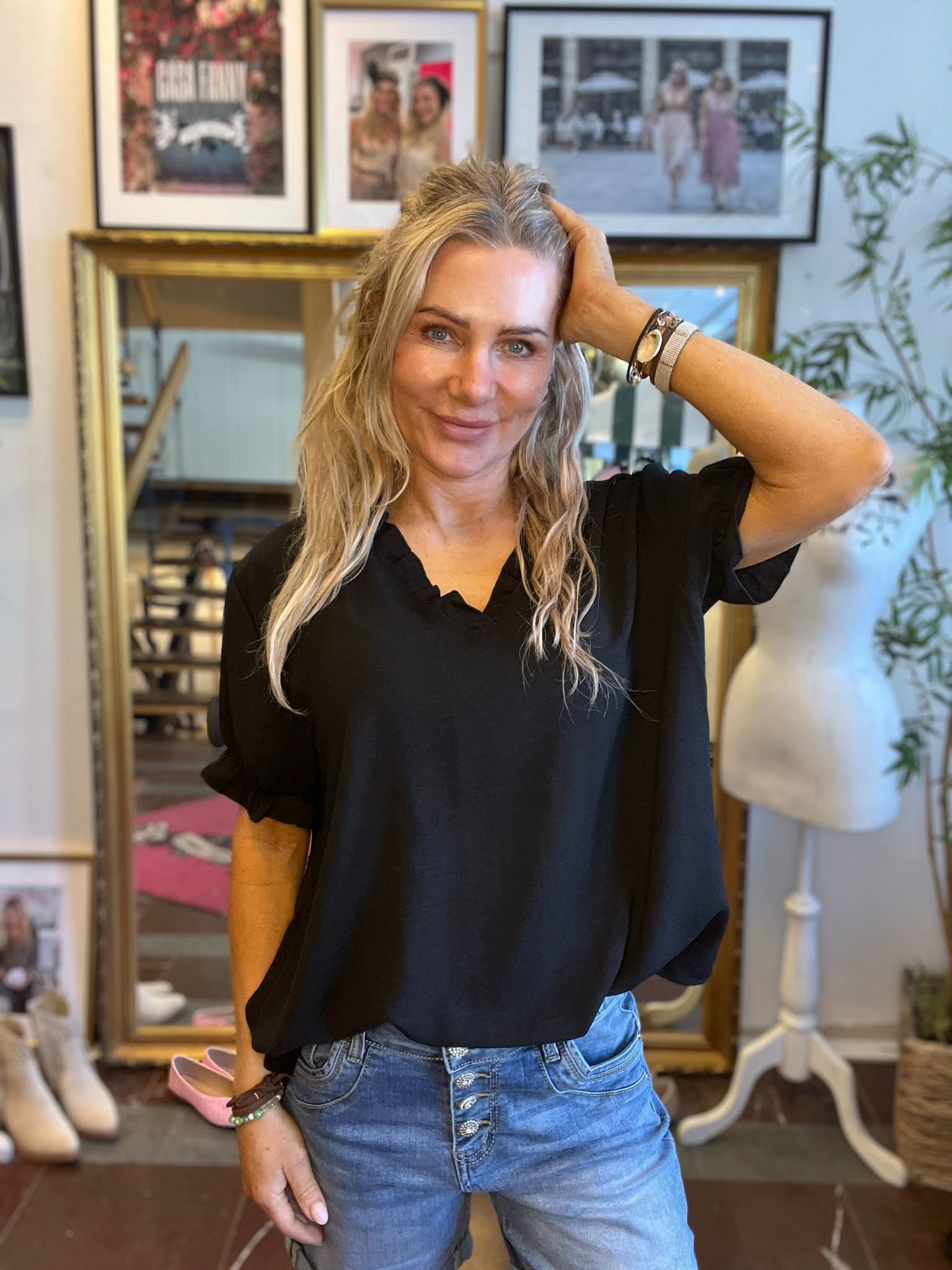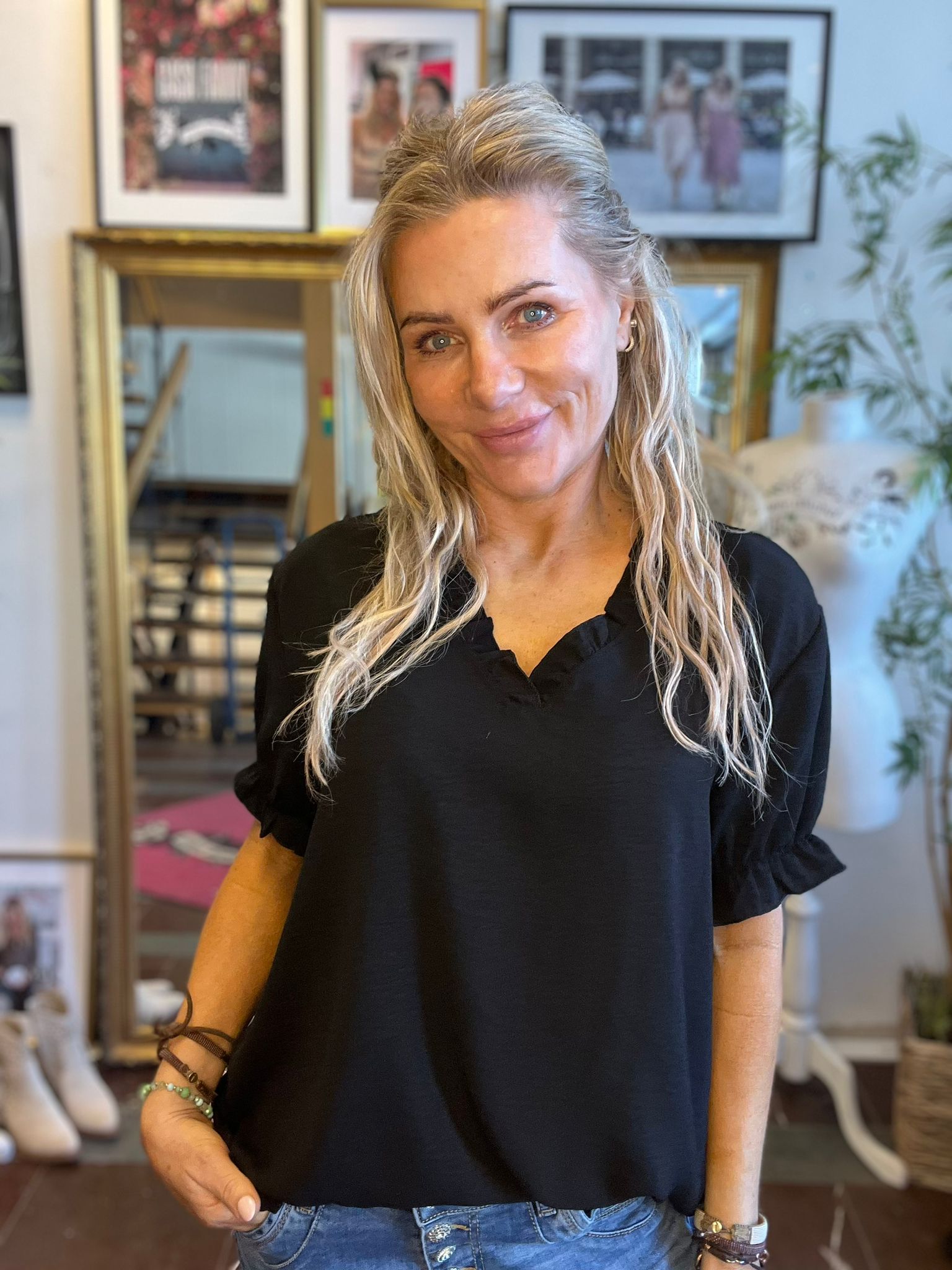 Thea – Kortärmad blus med volanger – Svart